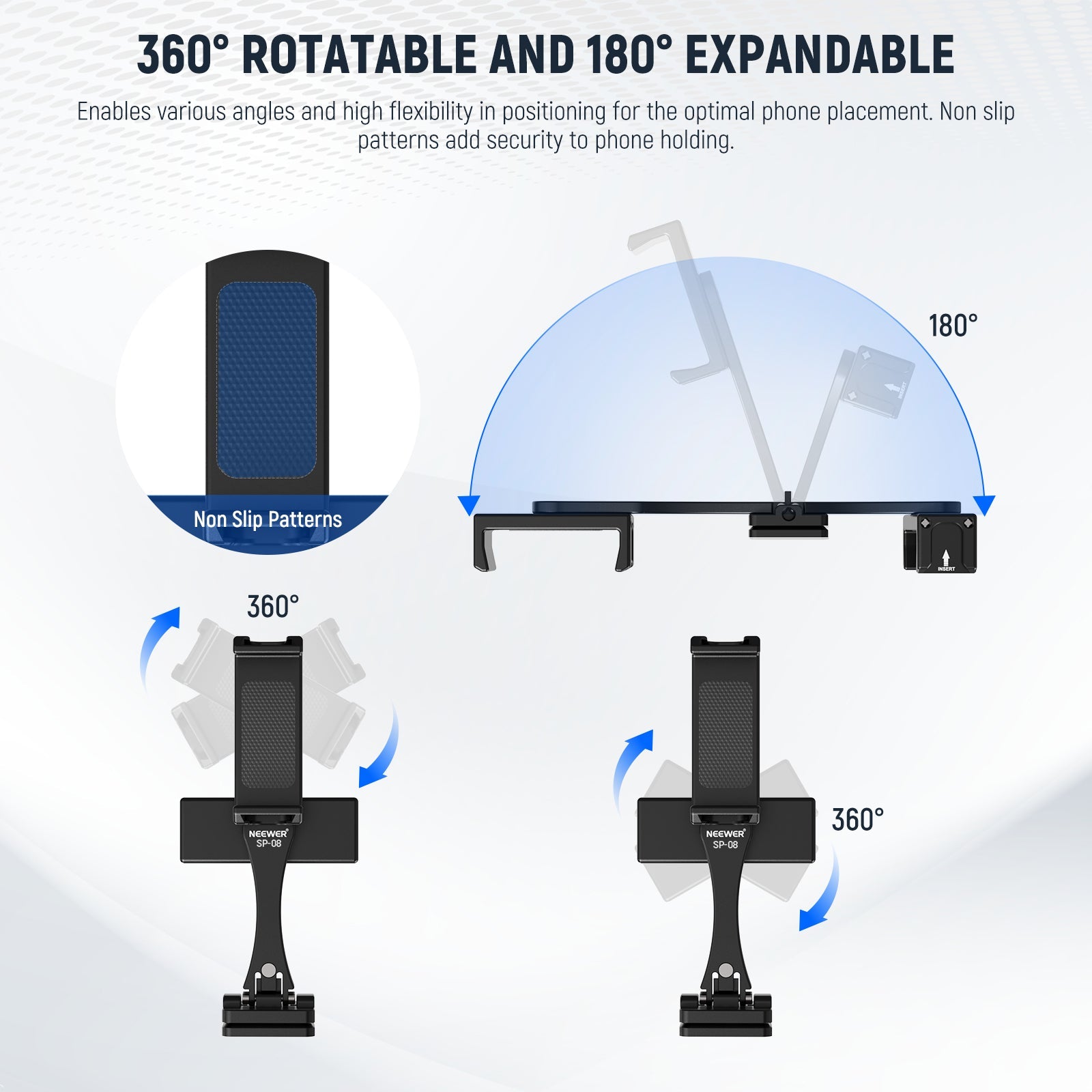 • Versatile Compatibility- NEEWER SP-08 phone tripod mount adapter has two phone clamps to hold two phones simultaneously, crafted with premium metal. The clamps range from 2.4" to 3.7" (6cm to 9.5cm), compatible with iPhone 15 Pro Max Samsung Galaxy S23 S24, compatible with Google Pixel, etc. They are 360° swivel and 180° expandable for versatile angles and optimal flexibility in phone mounting. Perfect for live on two platforms or using one phone to fulfill the function of a teleprompter