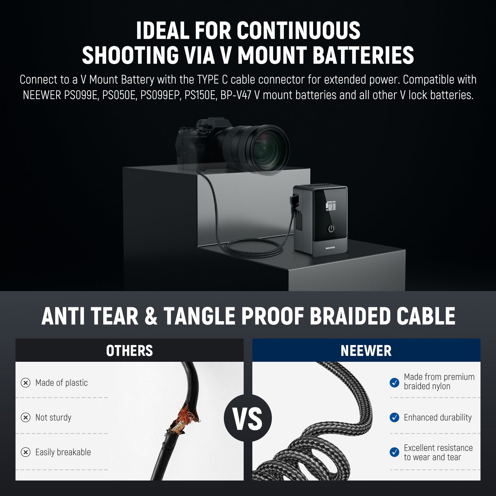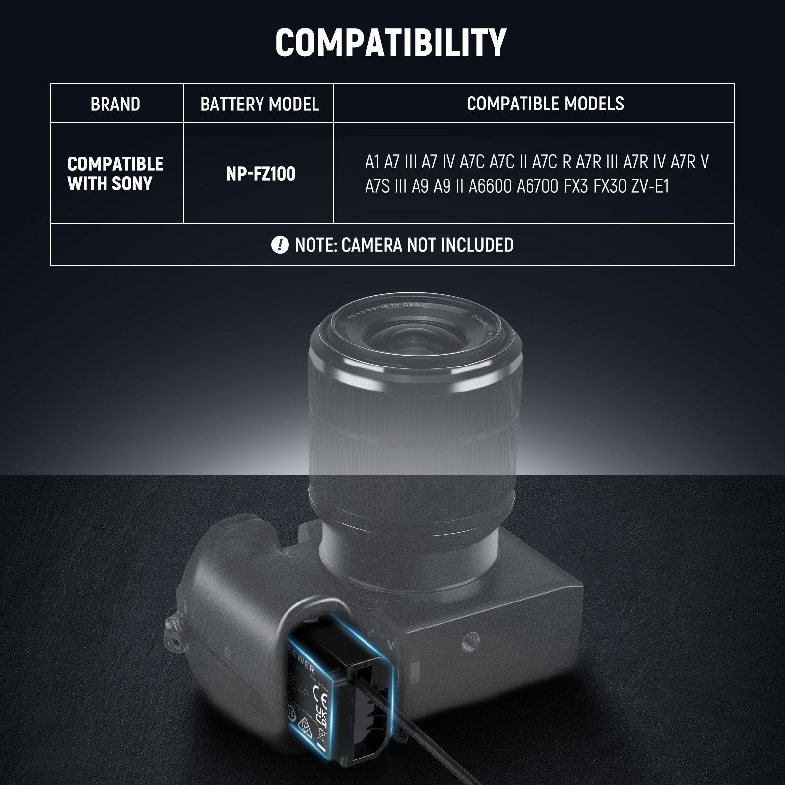 - Compatible Cameras- NEEWER USB C to NP-FZ100 dummy battery is a replacement for NP-FZ100 battery, compatible with Sony FX3 FX30 ZV-E1 A1 A6600 A6700 A7III A7IV A7C A7CII A7CR A7RIII A7RIV A7RV A7SIII A9 A9II cameras