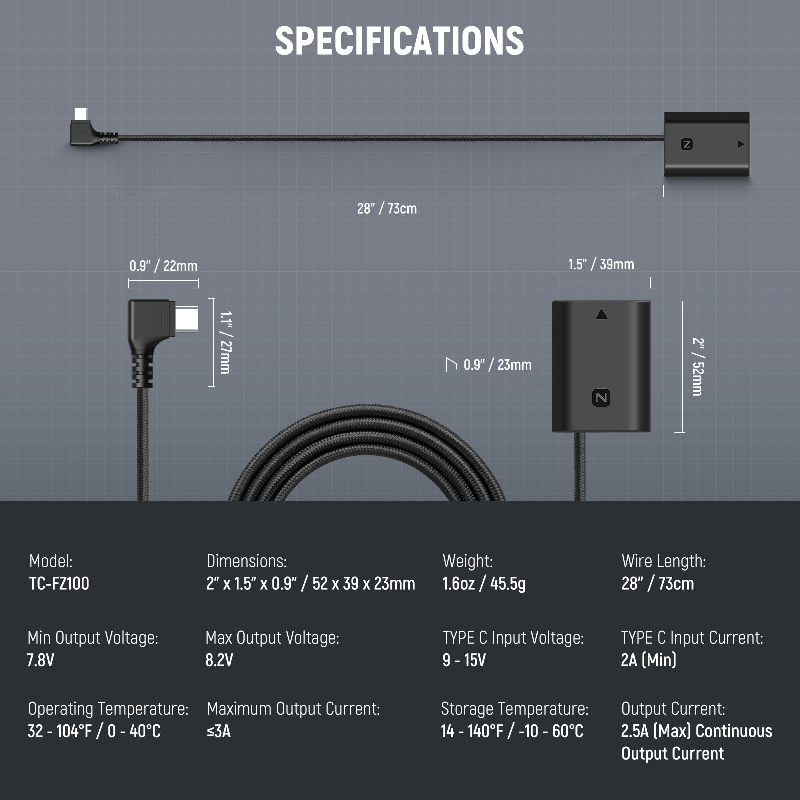- Item Type: USB C to NP-FZ100 Dummy Battery