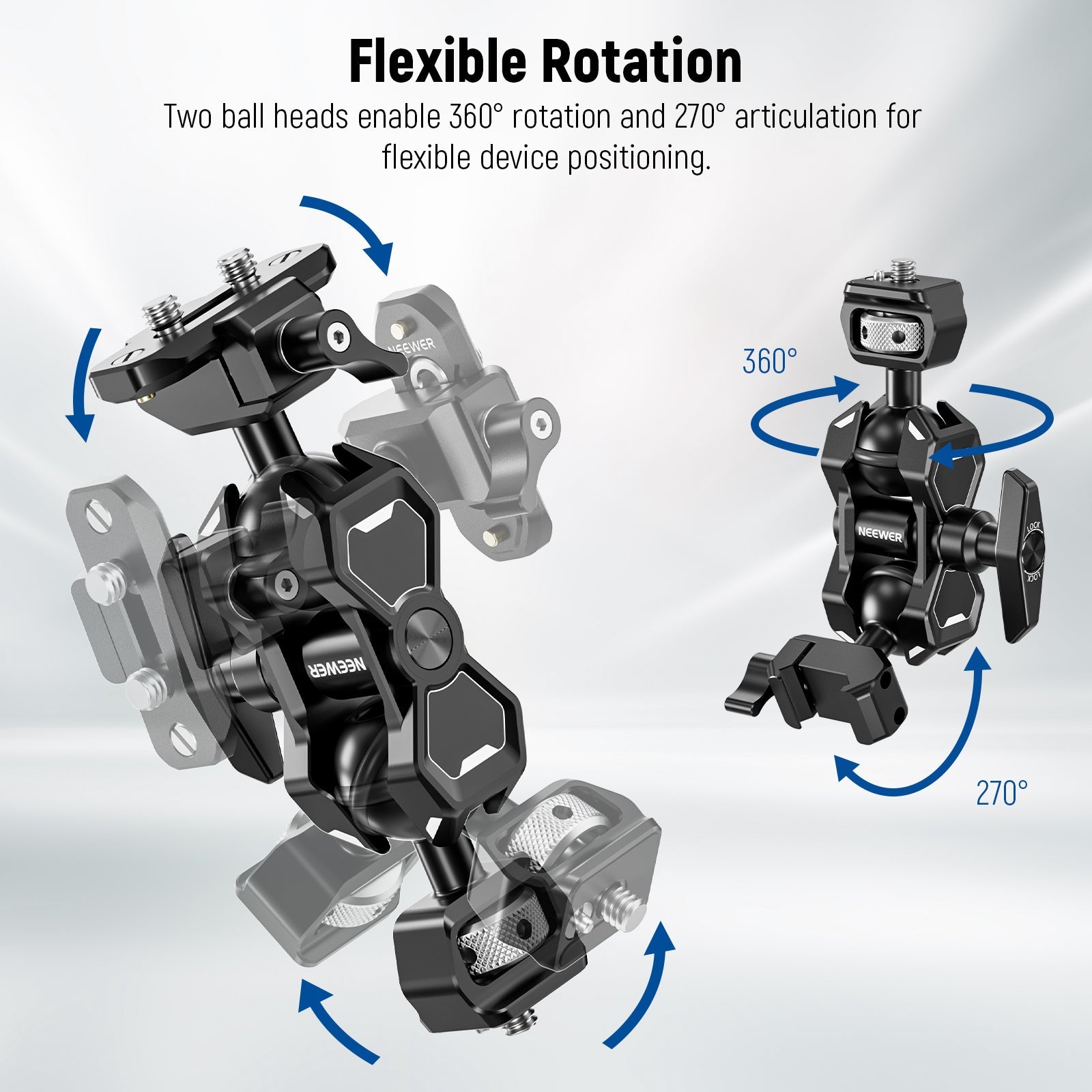 - 360° Rotation & 270° Tilt- Two ball heads enable 360° rotation and 270° articulating movements for flexible device positioning. Rubber rings increase friction and stability