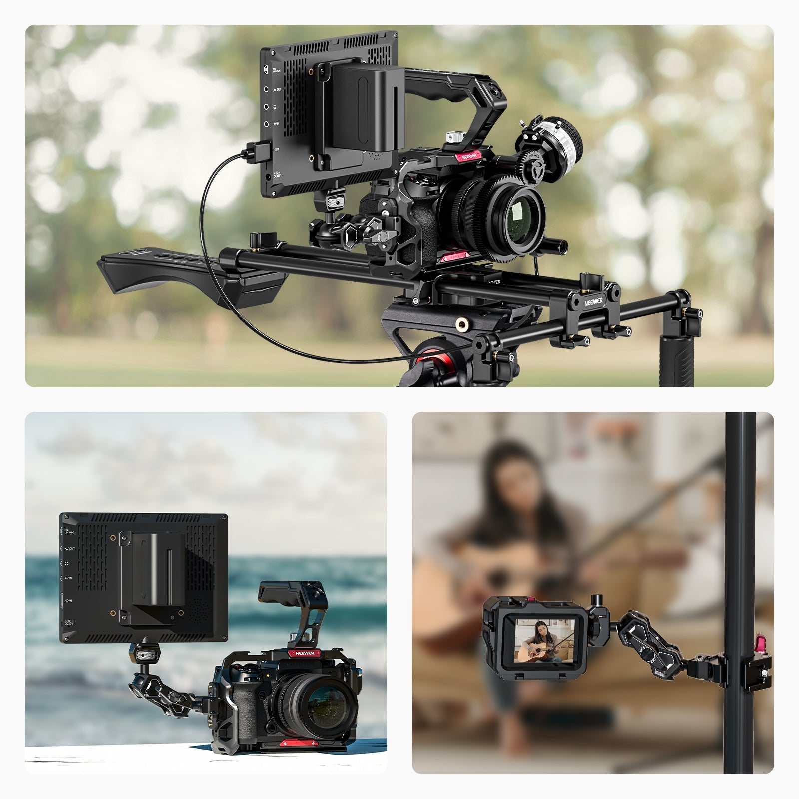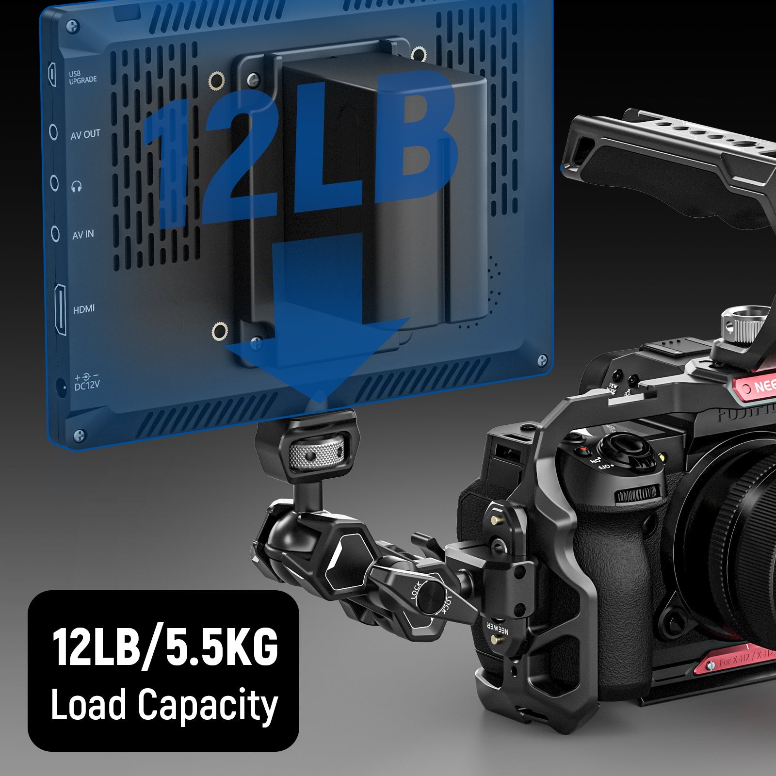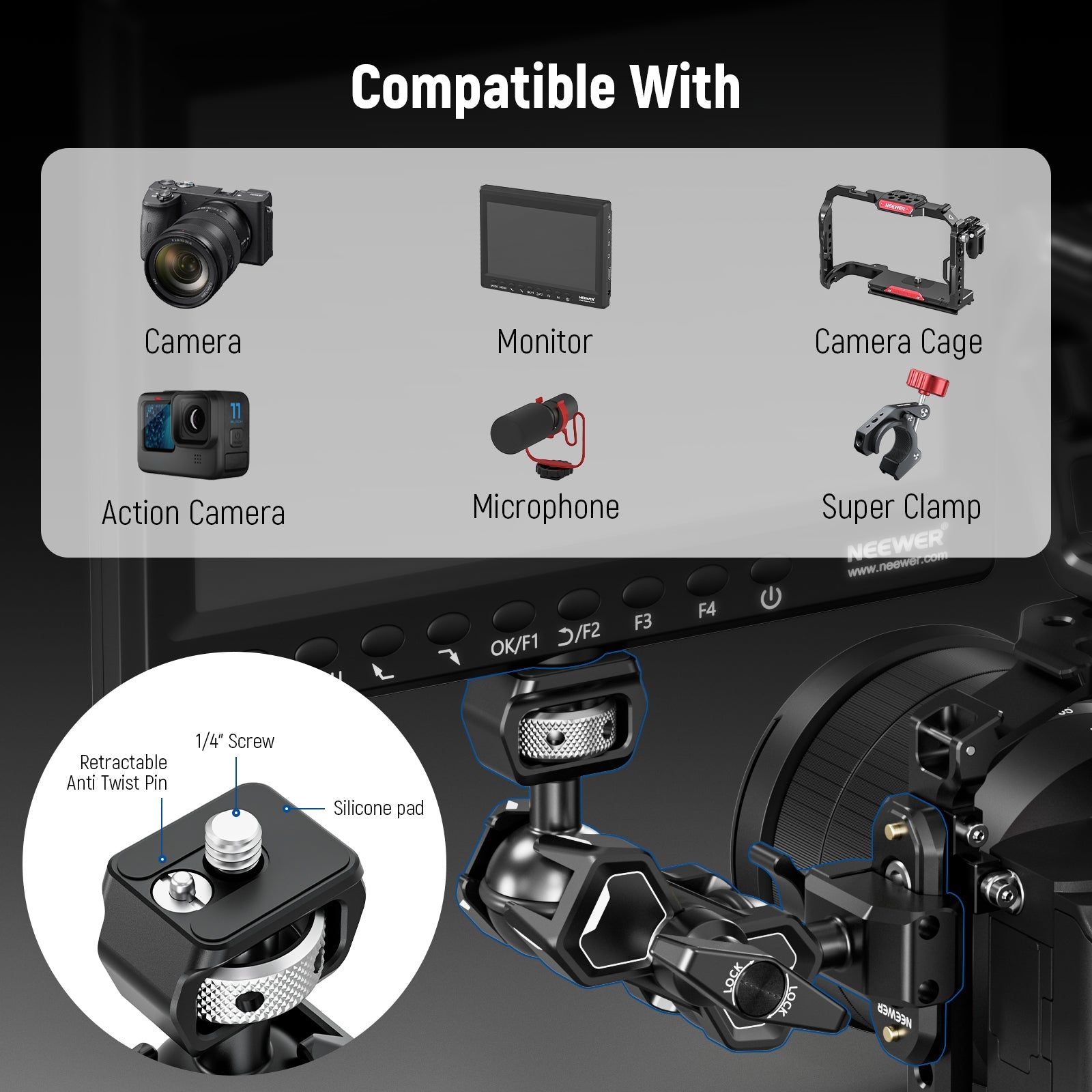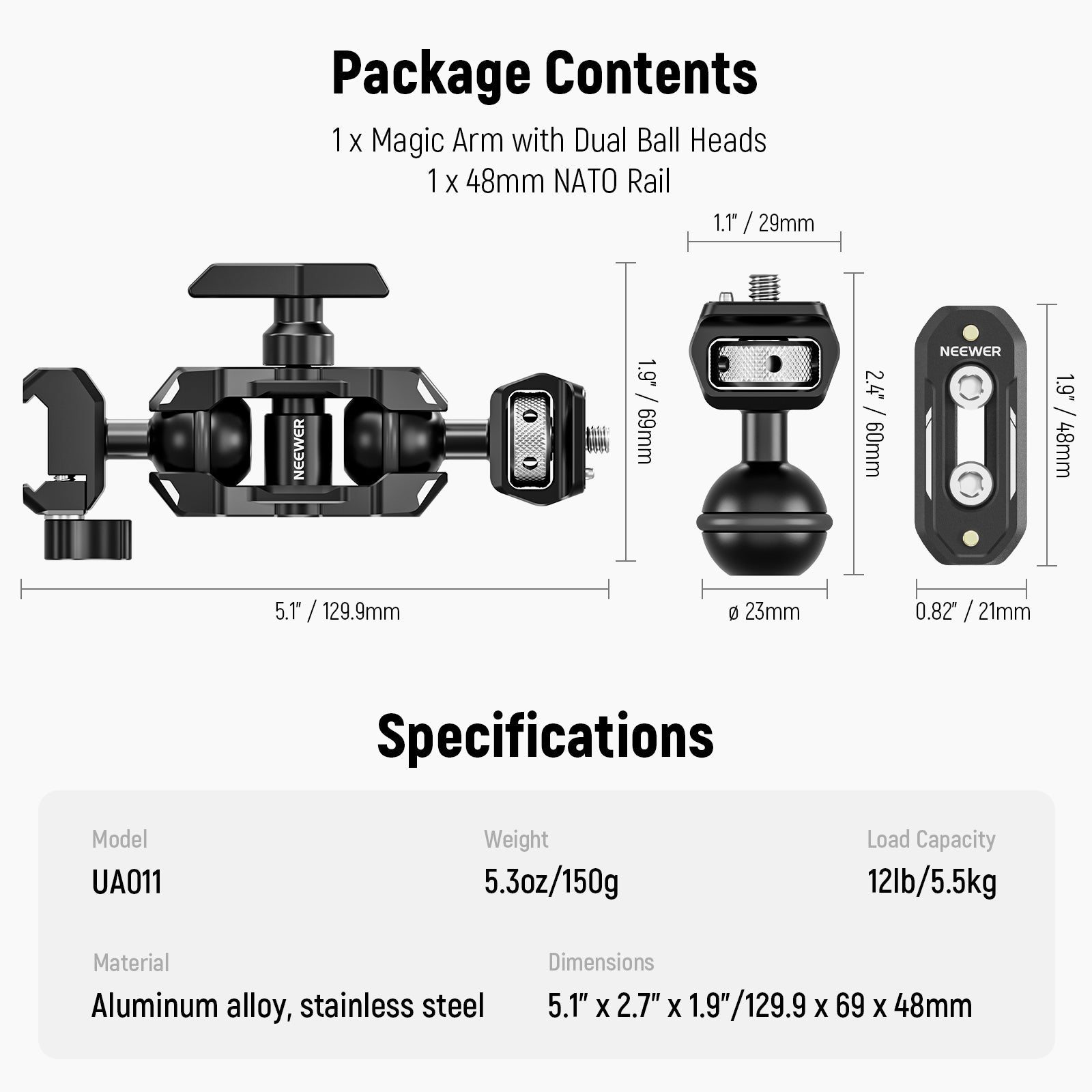 - Dual Ball Heads with 1/4" Screw & NATO Clamp- With a maximum load capacity of 12lb (5.5kg), the dual ball head magic arm features a NATO rail clamp for quick installation and flexible positions (a 48mm NATO rail is included), and a 1/4" screw with a retractable anti twist pin for field monitors, flashes, action cameras, microphones, and other accessories