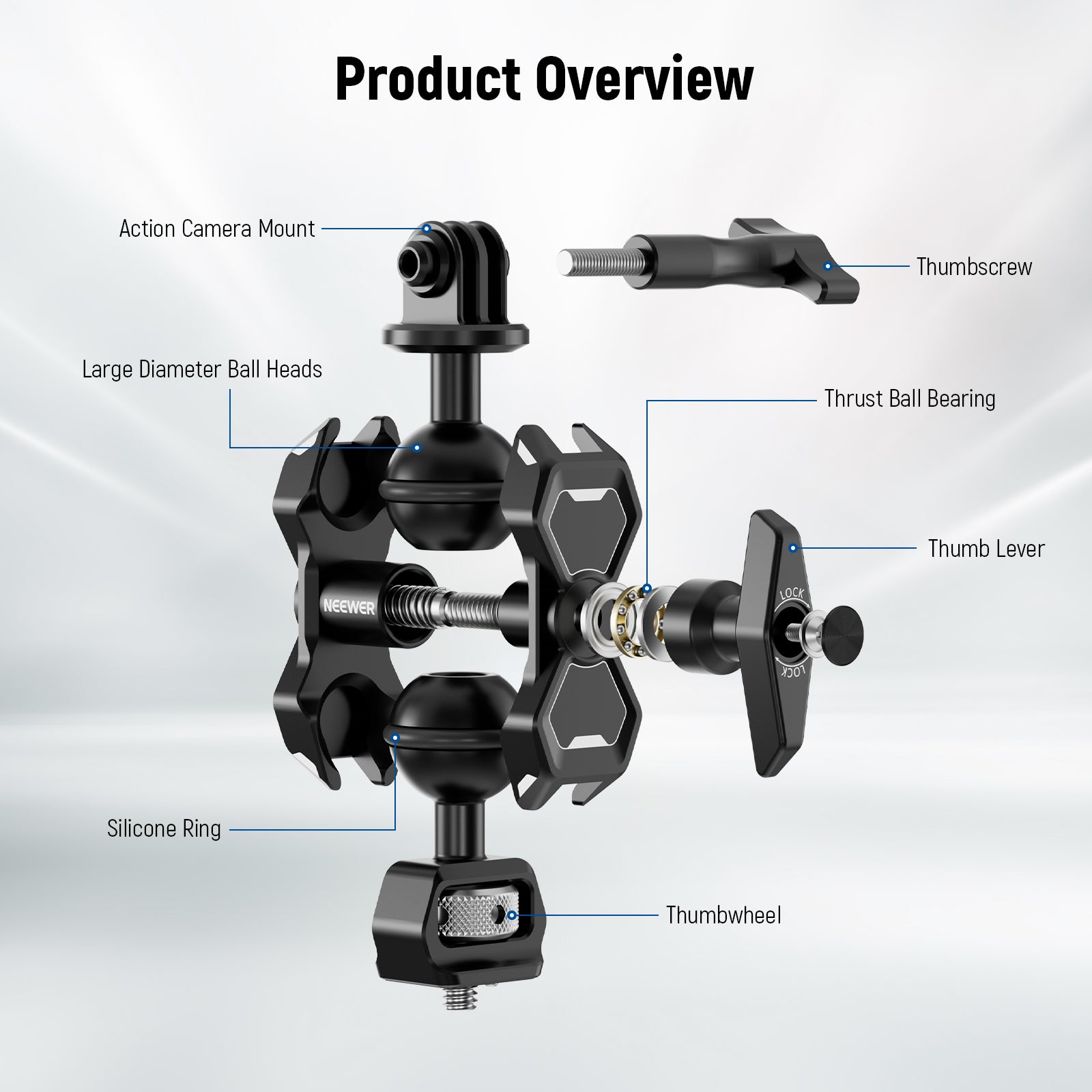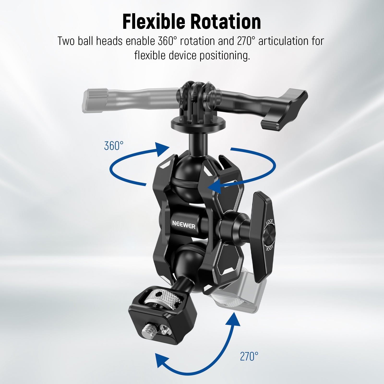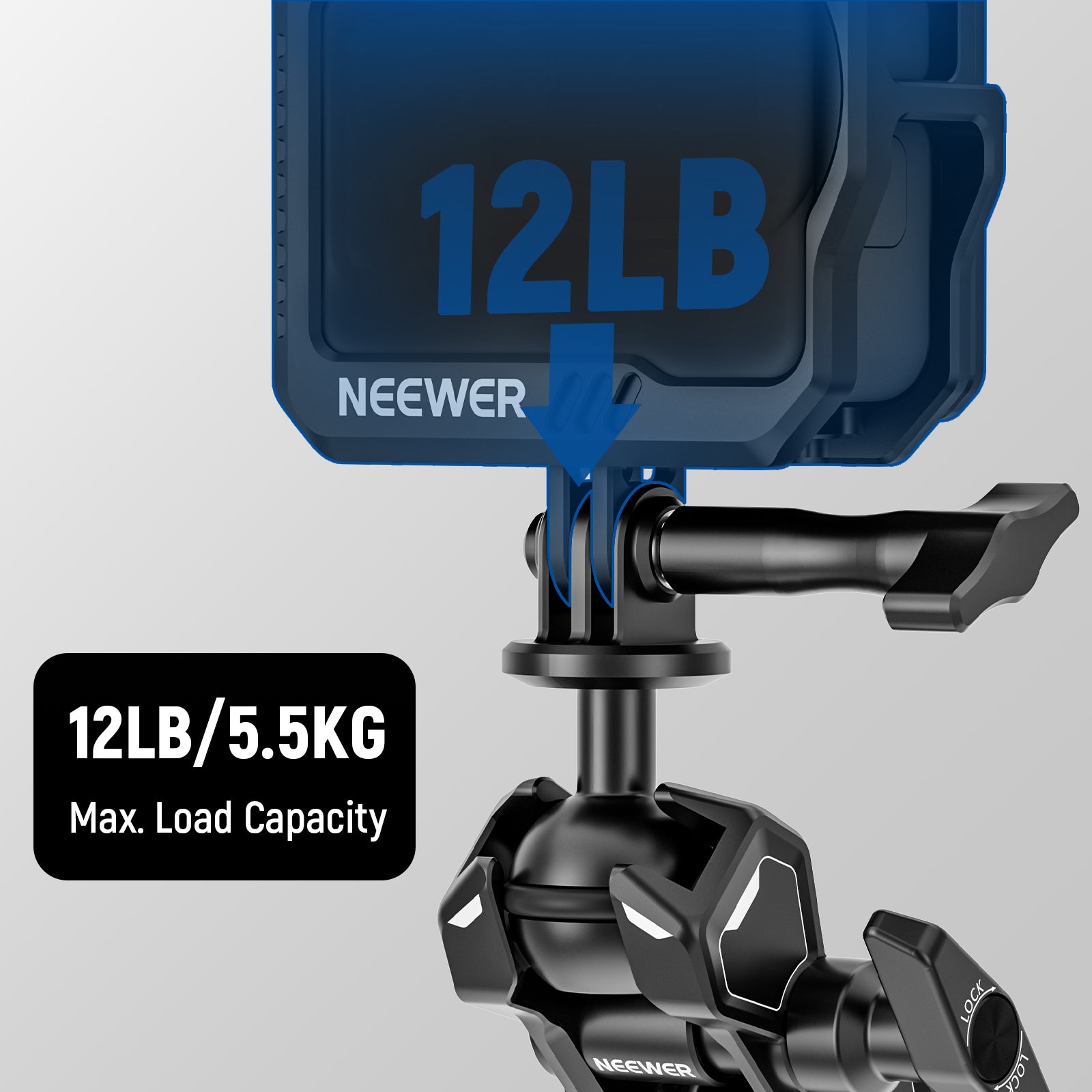 - Heavy Duty Magic Arm Action Camera Mount- NEEWER UA021 magic arm features dual ball heads for flexible positioning action camera mounting. There are rubber rings around ball heads to increase friction and make sure devices will be secured in place with the locking knob. Maximum load capacity is: 12lb (5.5kg)