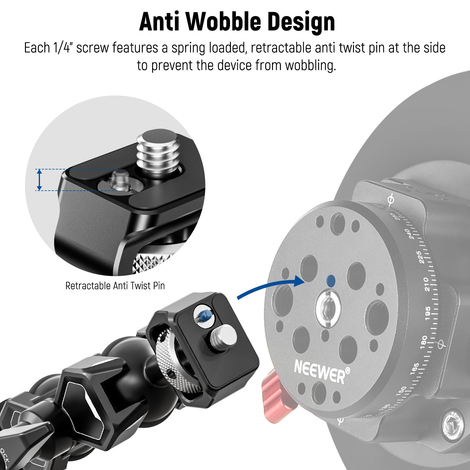 - 1/4" Screw Anti Twist Locating Pin- The 1/4" screw can attach to camera cages, super clamps, suction cups, and top handles via the knurled thumbscrew. Next to the screw, there is a spring loaded and retractable anti twist pin that prevents the magic arm from shaking and wobbling