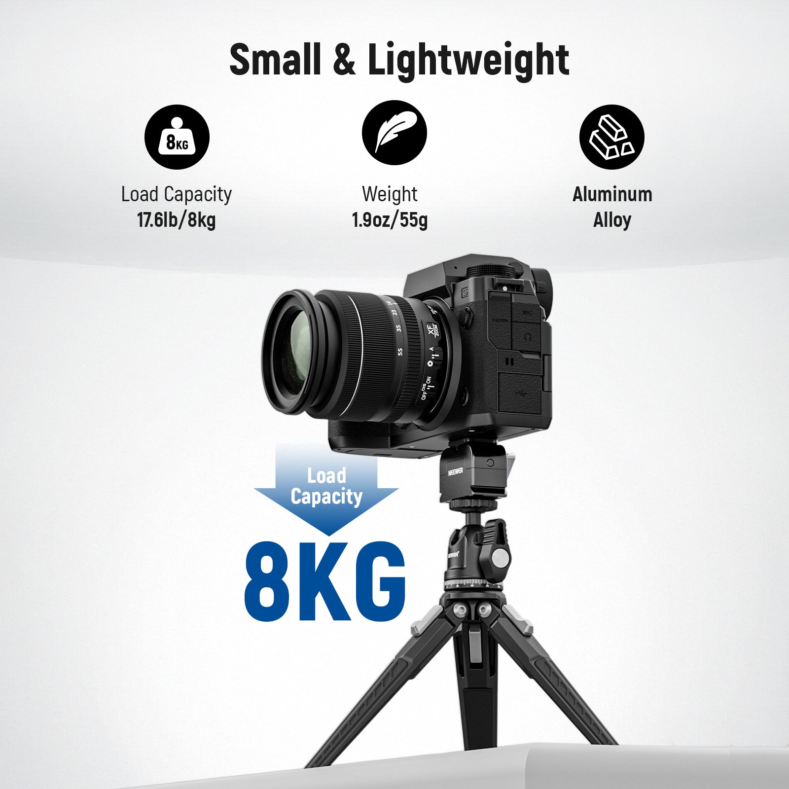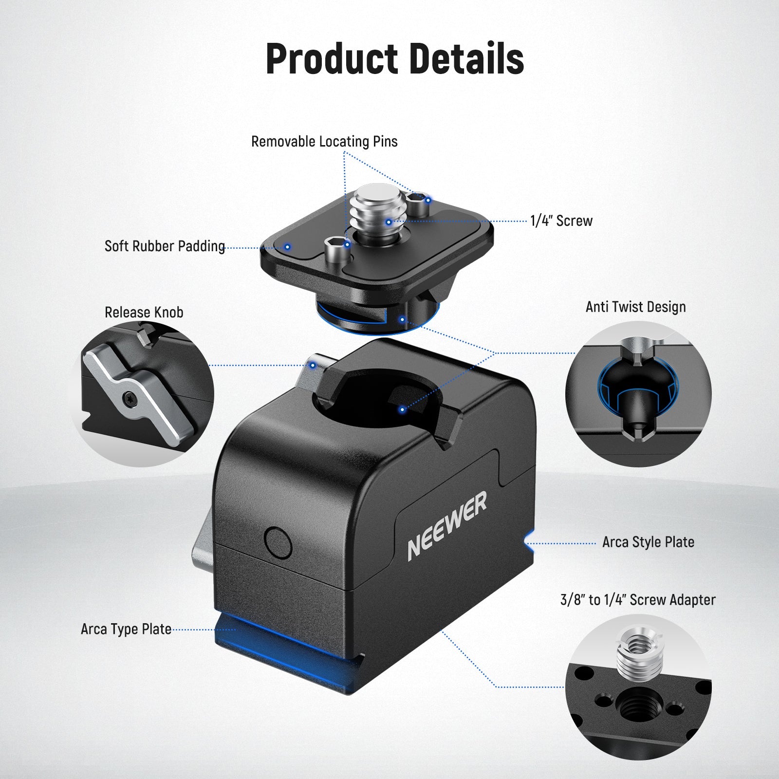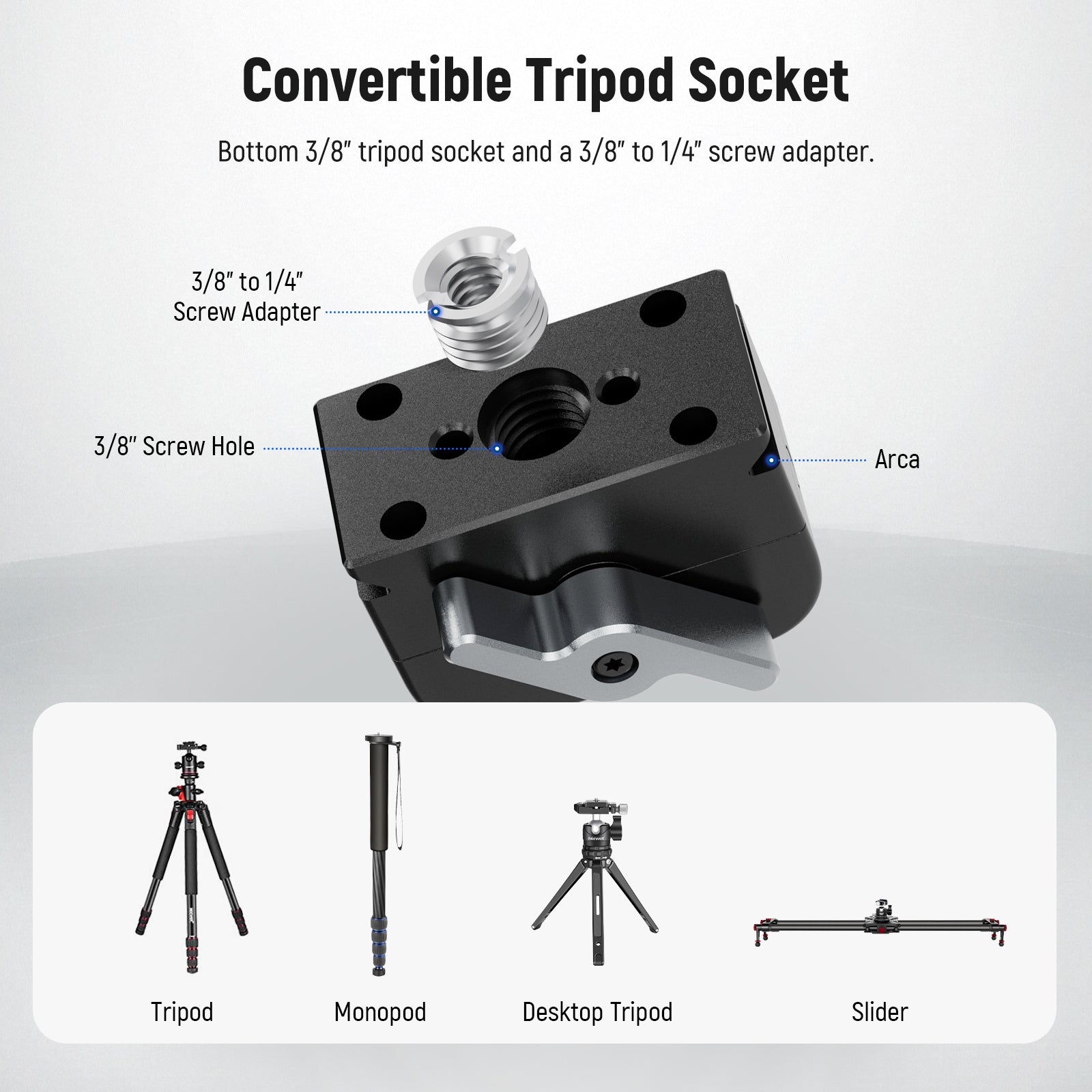 - Convertible Tripod Socket- With a bottom 3/8" tripod socket and a 3/8" to 1/4" screw adapter, the base can also mount on tripods (NEEWER M11), monopods, desktop stands, magic arms (NEEWER ST25 ST25C), ball head adapters, and other supports