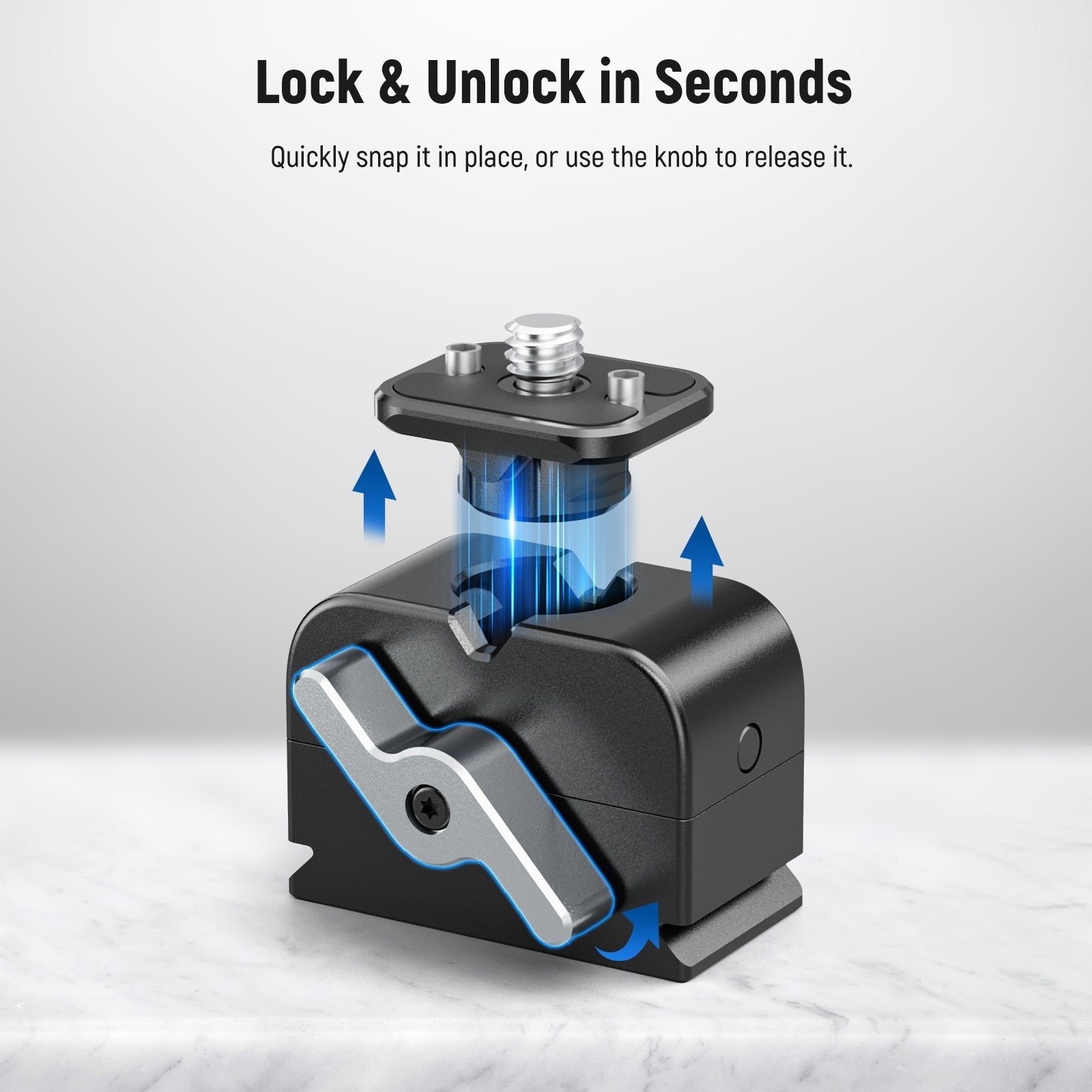 - Lock & Unlock in Seconds- Unlike traditional quick release plates that slide into the clamps, the NEEWER ST004 features a top plate that easily drops into the base with a single press, securely locking itself. To unlock, simply turn the quick release lock counterclockwise and lift the top plate
