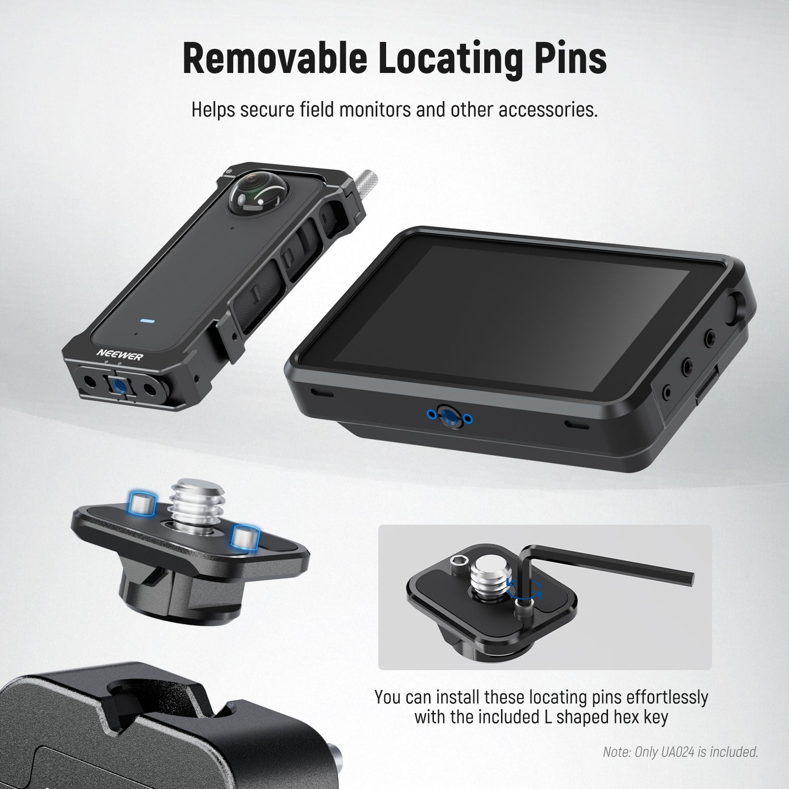 - Detachable Locating Pins- Detachable locating pins are compatible with Atomos Ninja V Ninja V+ Atomos Shinobi 7. Once installed on the top plate, they can prevent these certain types of field monitors from deflection. You can install these locating pins effortlessly with an included L-shaped hex key