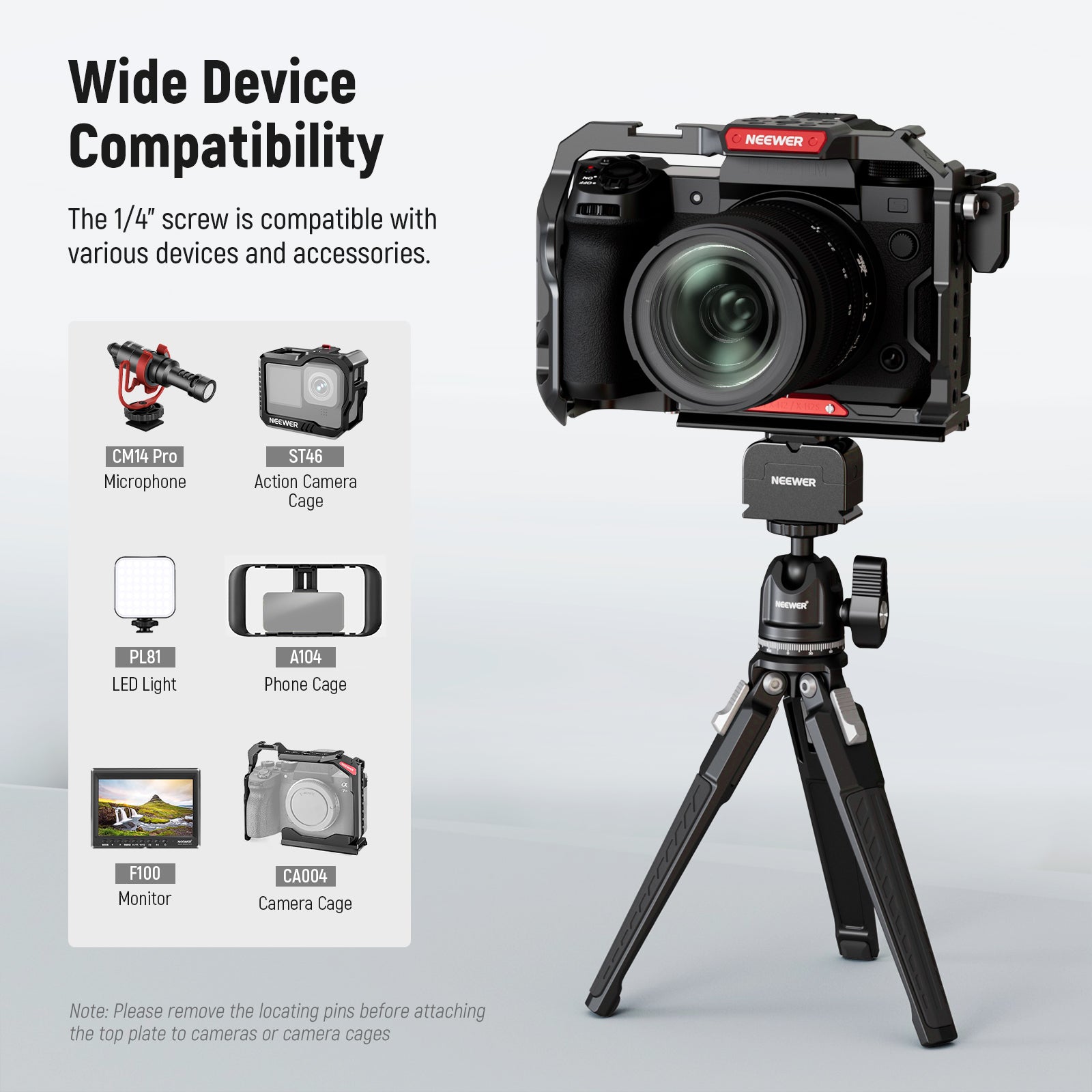- Wide Device Compatibility- The 1/4" screw is compatible with various DSLR cameras, mirrorless cameras, vlog cameras, LED lights, monitors, and other devices and accessories less than 17.6lb (8kg) in weight. An included L-shaped hex key helps you tighten the screw with ease. Note: Please remove the locating pins before attaching the top plate to cameras or camera cages