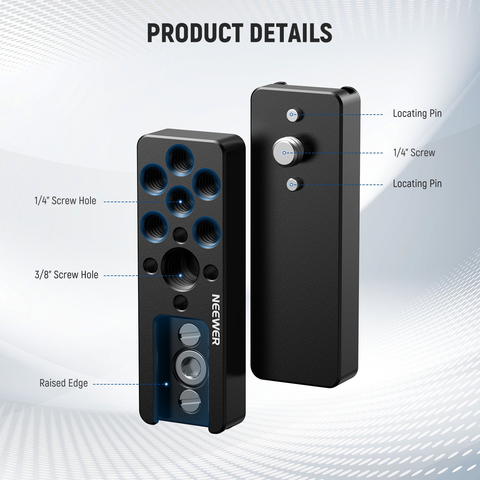 - 1/4" & 3/8" Mounting Points- With multiple 1/4" and 3/8" threads, it works like a camera cheese plate for NEEWER PS001/PS005 Mini V Mount Battery Plate, PS004E NP-F Battery Adapter Plate, ST21 Magic Arm with Ball Head, UA010 Magic Arm with 3/8" ARRI Locating Screw and other photography accessories