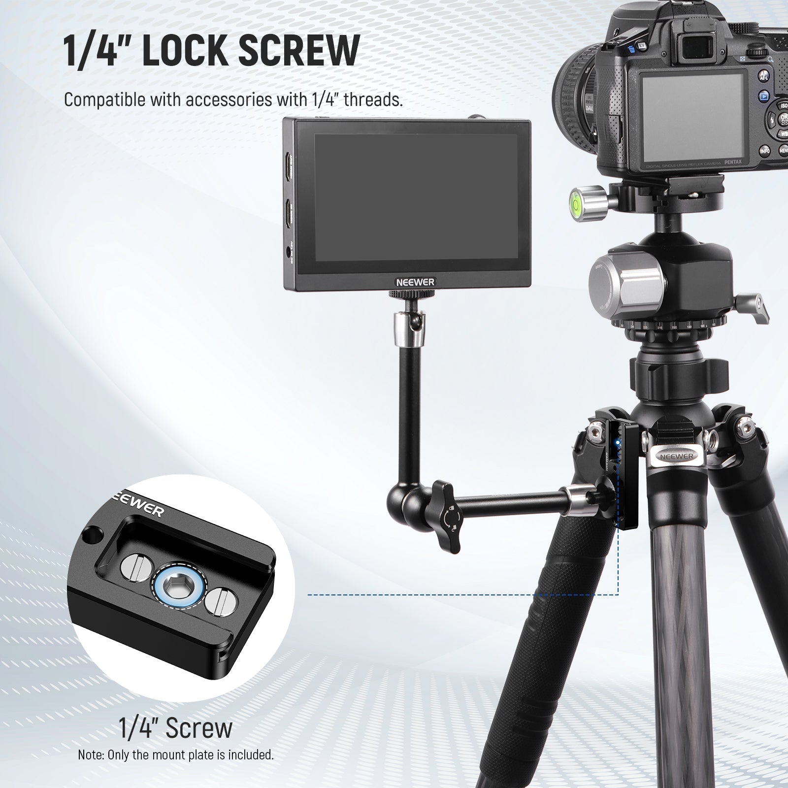 - Tripod Accessory Mount Adapter- This multipurpose accessory mounting plate can mount different accessories at the same time. It attaches to a tripod with the 1/4" thread, such as NEEWER LITETRIP LT35 61" Carbon Fiber Travel Tripod, TP72A Fluid Head Video Tripod Monopod, TP74/TP75 74" Pro Video Tripod with Fluid Head, or camera cages and field monitor mounts. Ideal for outdoor photography, YouTube/TikTok vlogging, live streaming, interviewing, and other applications
