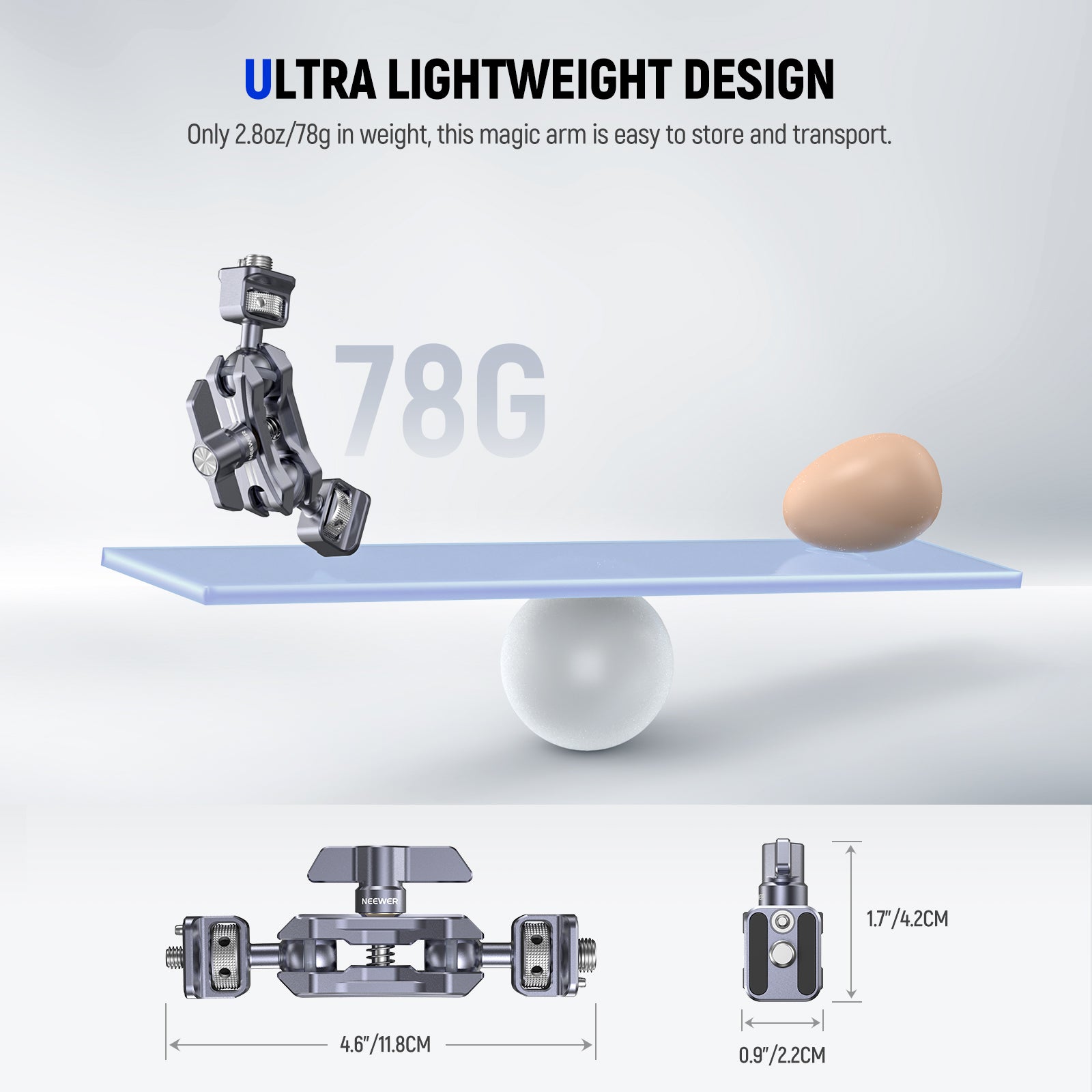 • Ultra Lightweight Design- Optimized with a reduced weight (2.8oz/78g), this magic arm is more ideal for outdoor photography, filmmaking, vlogging, and live streaming. At 4.6"x1.7"x0.9"/118x42x22mm, it is portable and easy to fit inside your baggy