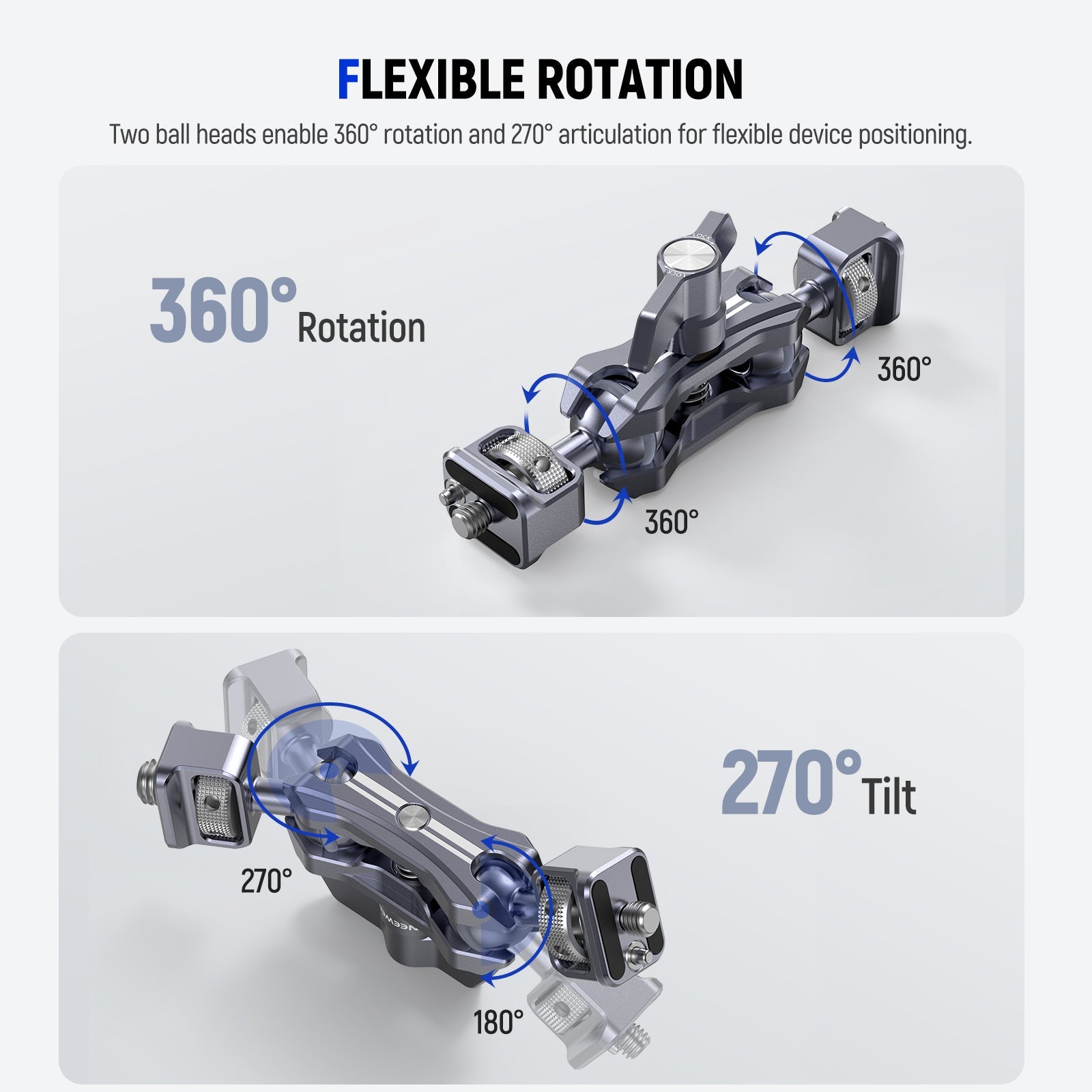 • 360° Rotation & 270° Tilt- This magic arm camera mount with two ball heads enable 360° rotation and 270° tilt for flexible positioning. Rubber rings increase friction for extra security