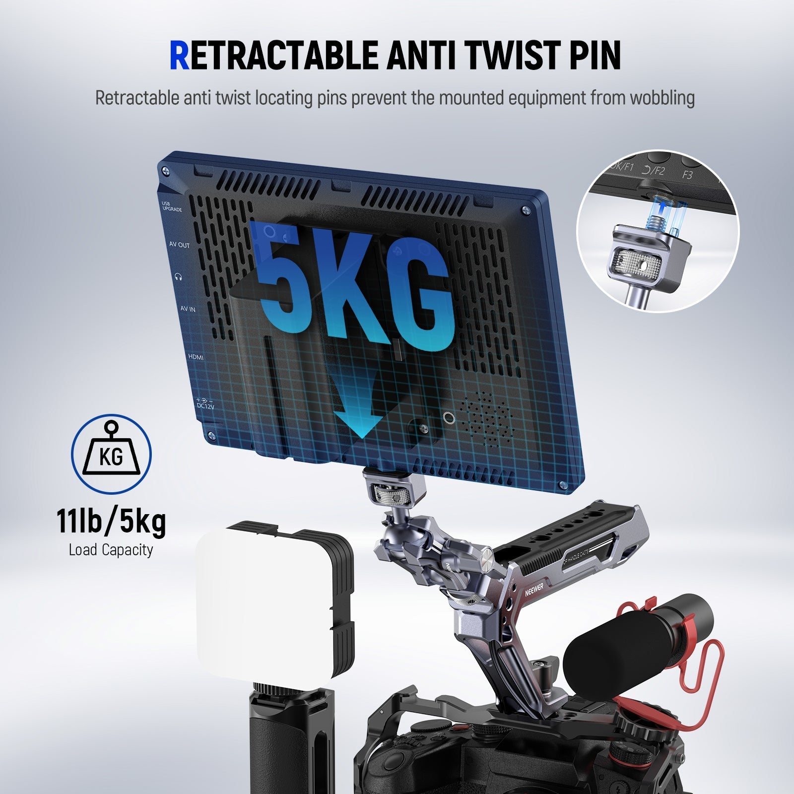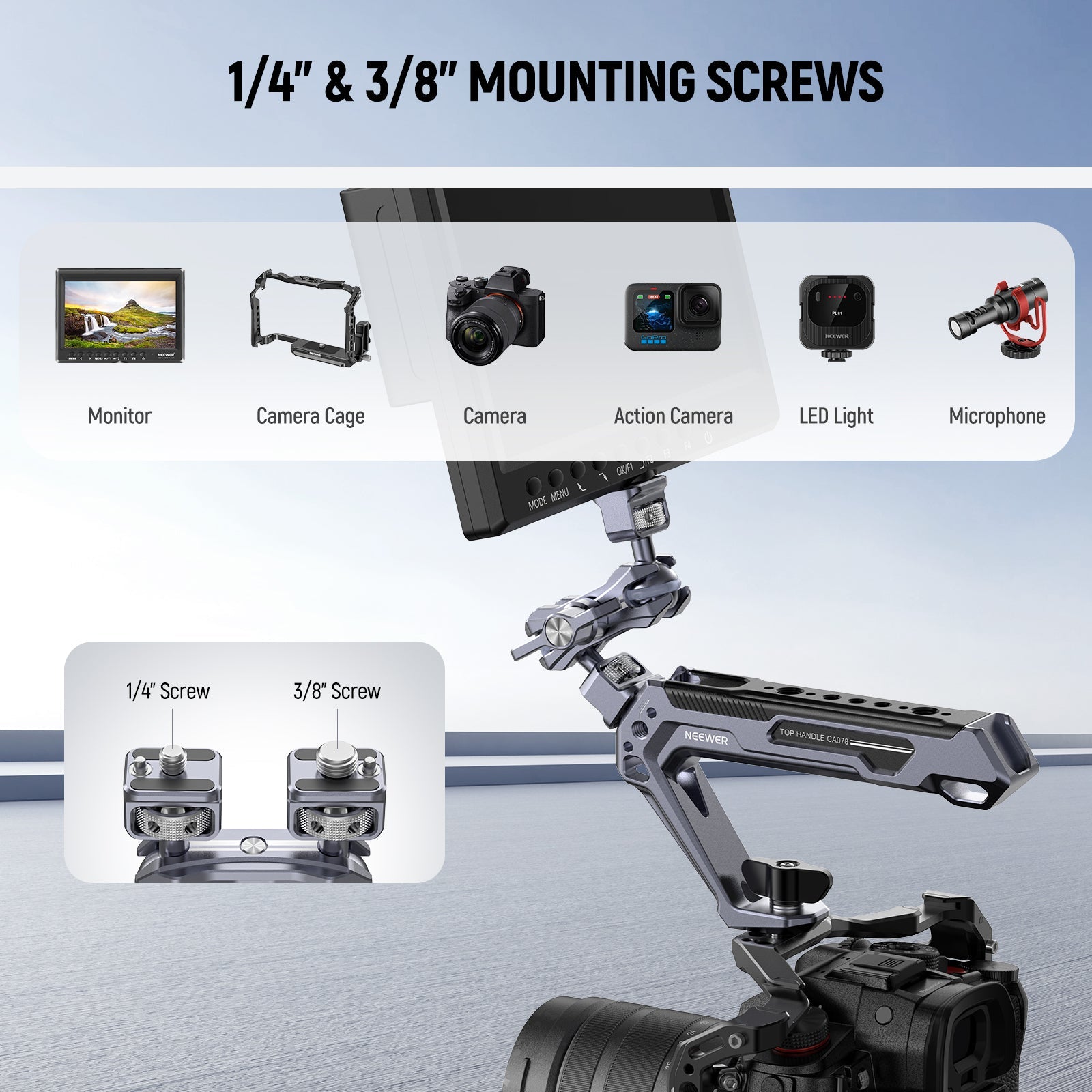• 1/4" & 3/8" Mounting Screws- 1/4" and 3/8" screws are compatible with a range of devices up to 11lb/5kg, including field monitors, LED video lights, microphones, action cameras, and mirrorless cameras. Also compatible with SmallRig and NEEWER camera cages, video rigs, and super clamps