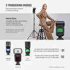 - Sync Triggering Mode: Hot shoe, S1/S2, optical command