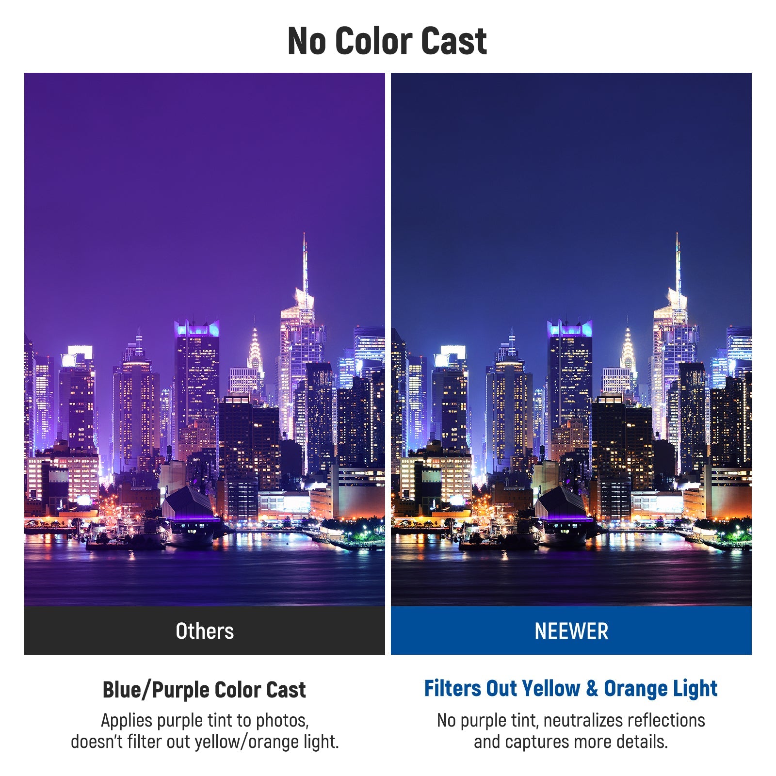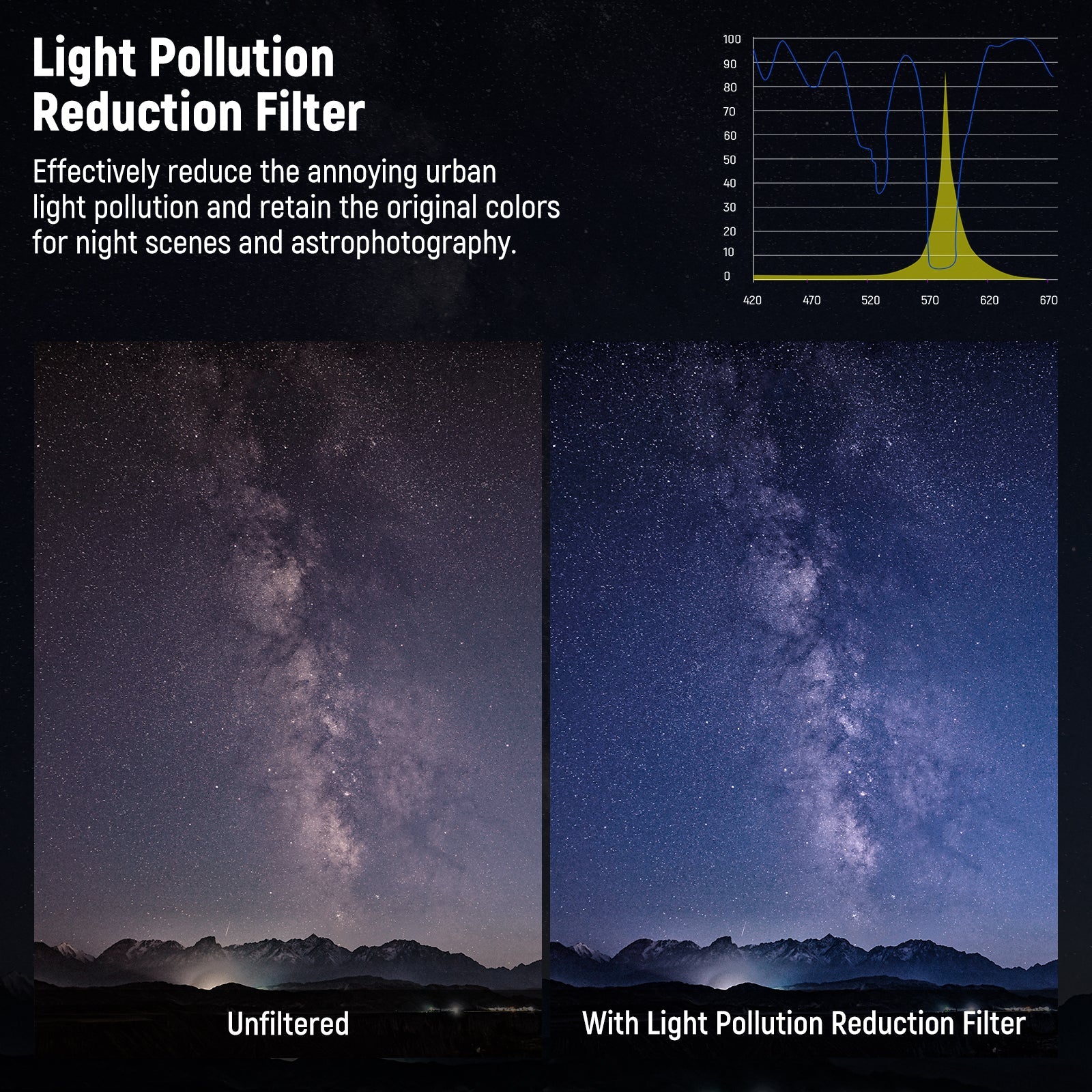 - No Color Cast- This night sky light pollution reduction filter effectively "cools down" the yellow and orange wavelengths, reduces light pollution entering the lens, to reproduce the original color for more vivid and detailed night sky images
