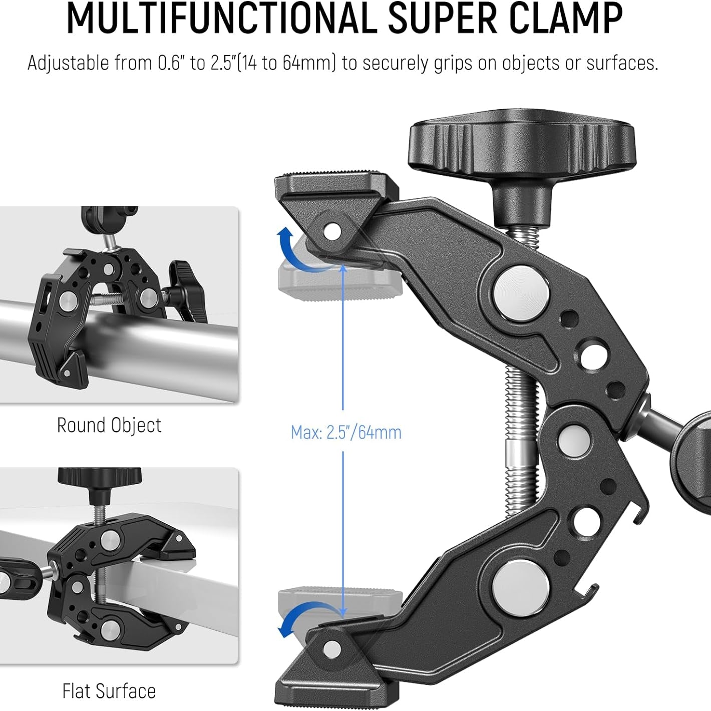 - Multiple Accessory Mounting Points- 1/4" threads, 3/8" threads with ARRI locating holes, and cold shoes can connect several accessories for enhanced video quality. These accessories included CM14 Pro Microphone, PL81 LED Video Light, ST25 Magic Arm, MA006 monitor mount, and F500 Field Monitor