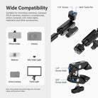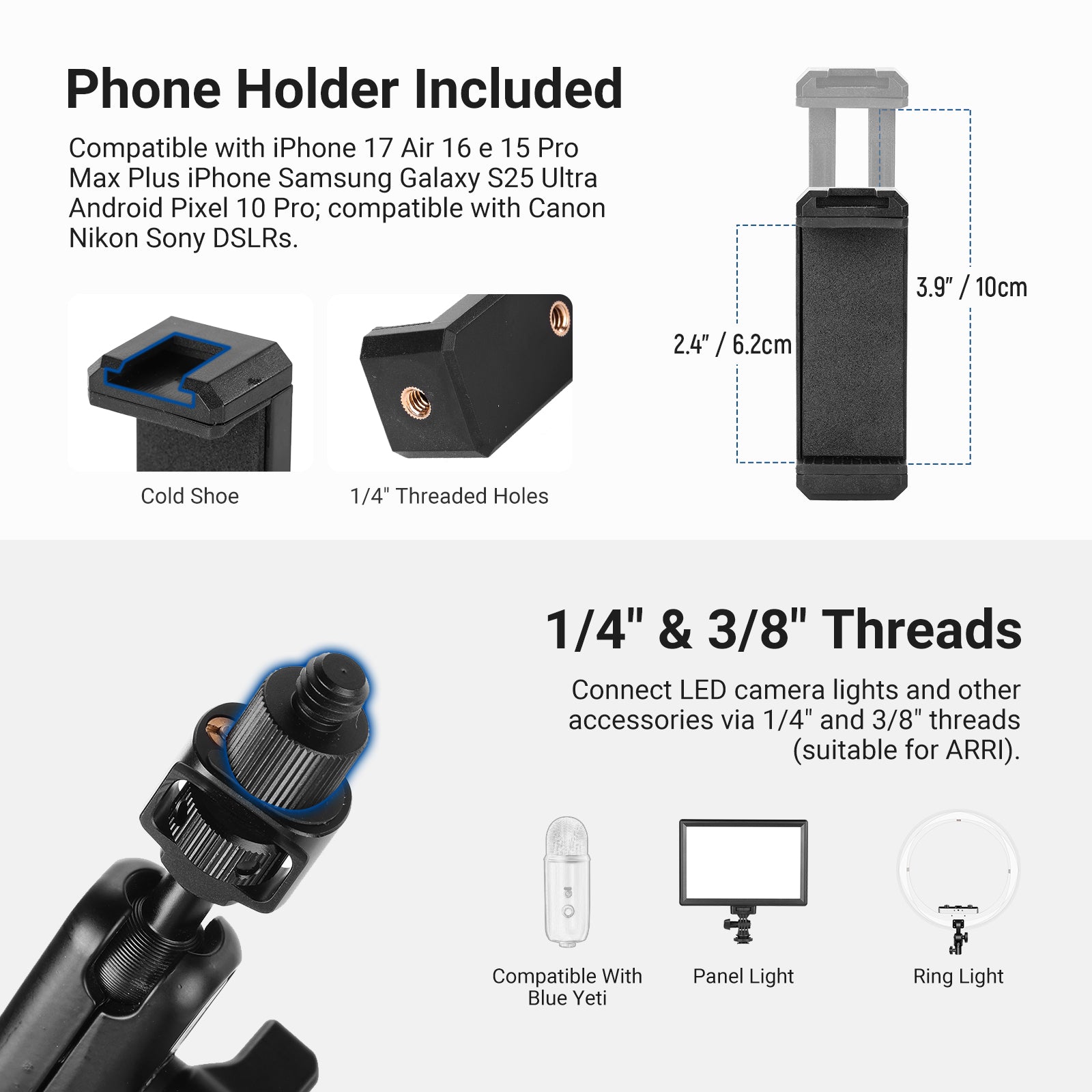 - Wide Compatibility- Phone holder compatible with iPhone 17 Air 16 e 15 Pro Max Plus i Phone Samsung Galaxy S25 Ultra Android Pixel 10 Pro; compatible with Canon Nikon Sony DSLRs; compatible with GoPro Hero 13 Go Pro 12 Insta360 X5 Insta 360 X4 X3 DJI Max 360 Pocket 3 Creator Combo (adapter not included); also for LED video lights and more filming accessories via 1/4" & 3/8" threads for ARRI