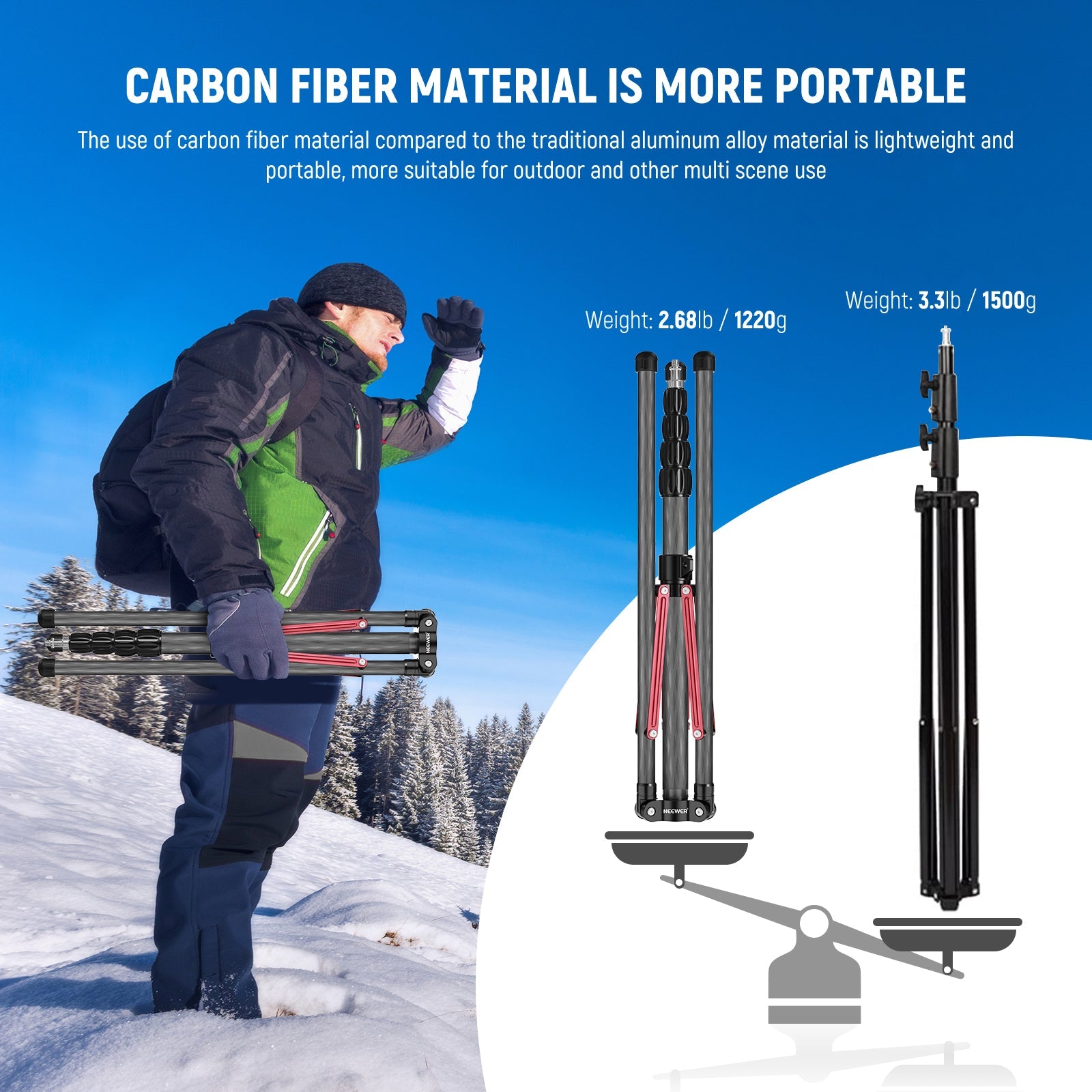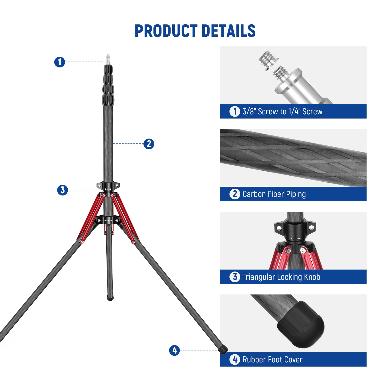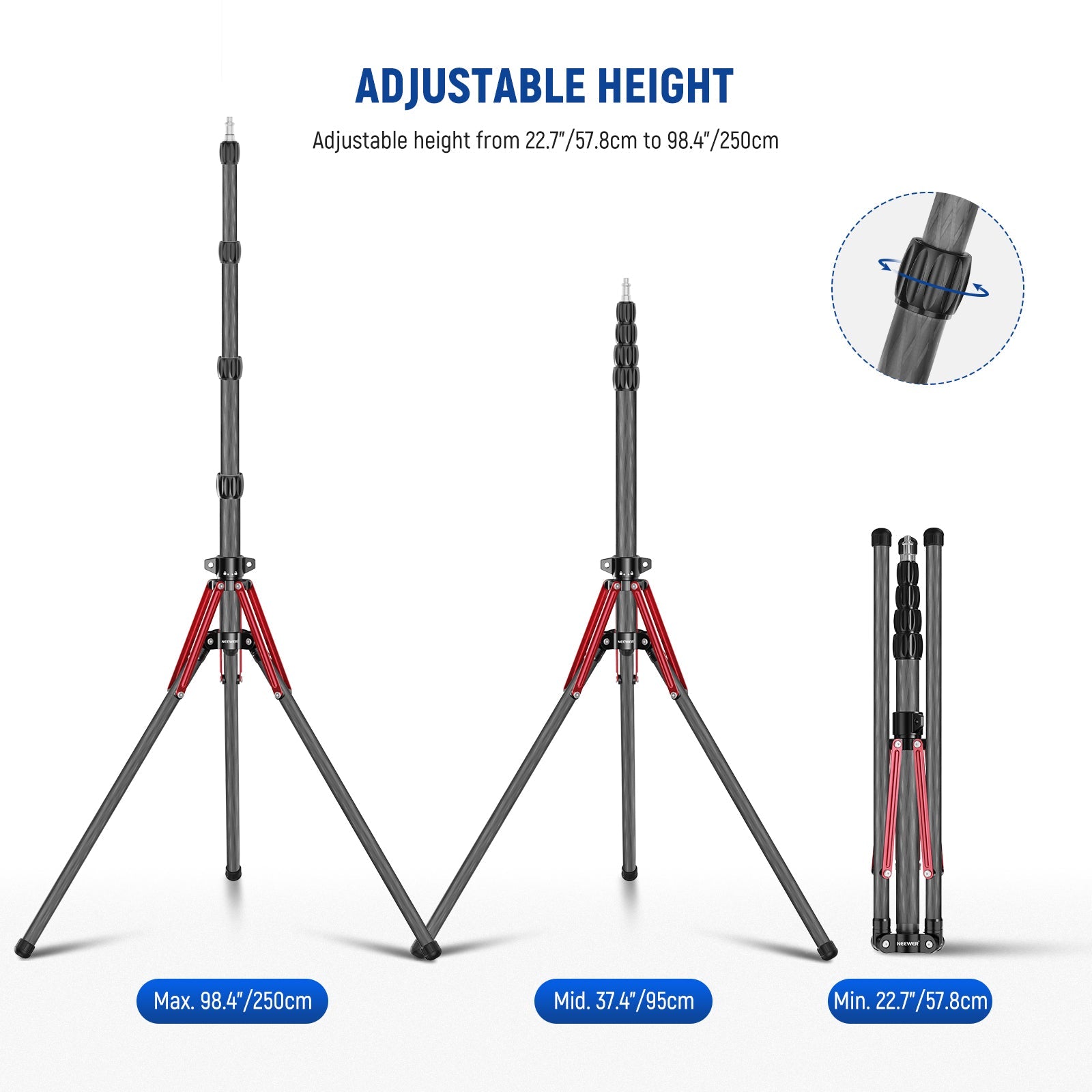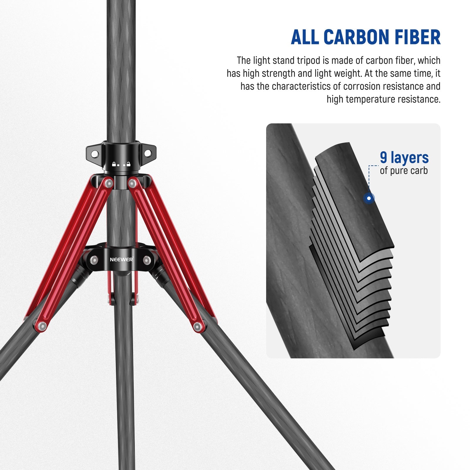 - Thicker & Stronger Carbon Fiber Build- Engineered with tough yet lightweight carbon fiber, the NEEWER ST250R tripod stand features a thickened carbon fiber made with an increased 32mm tube diameter and a maximum load capacity of 11lb/5kg. It is light weight to carry and resistant to scratches and corrosion, as well as difficult working conditions of heat or freezing. The rubber foot covers add friction for enhanced stability