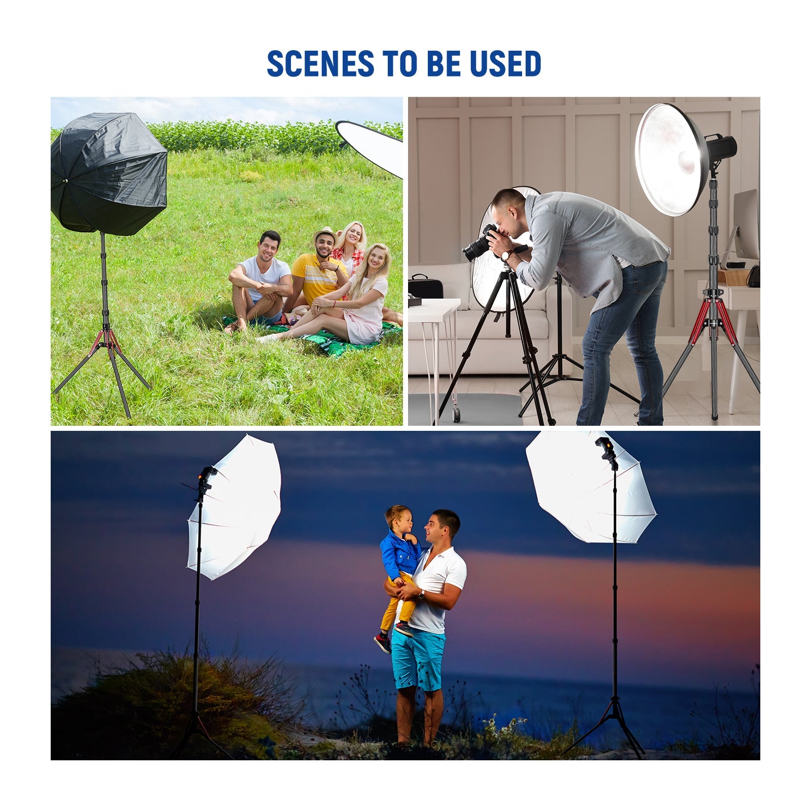- Extendable & Lightweight- Thanks to its small weight of 2.7lb (1.22kg), the tripod is easy to carry around for outdoor photography lighting and video recording. With a telescopic center column, the tripod is adjustable from 24.6 to 98.4in (62.5cm to 250cm) and provides flexible height regulation