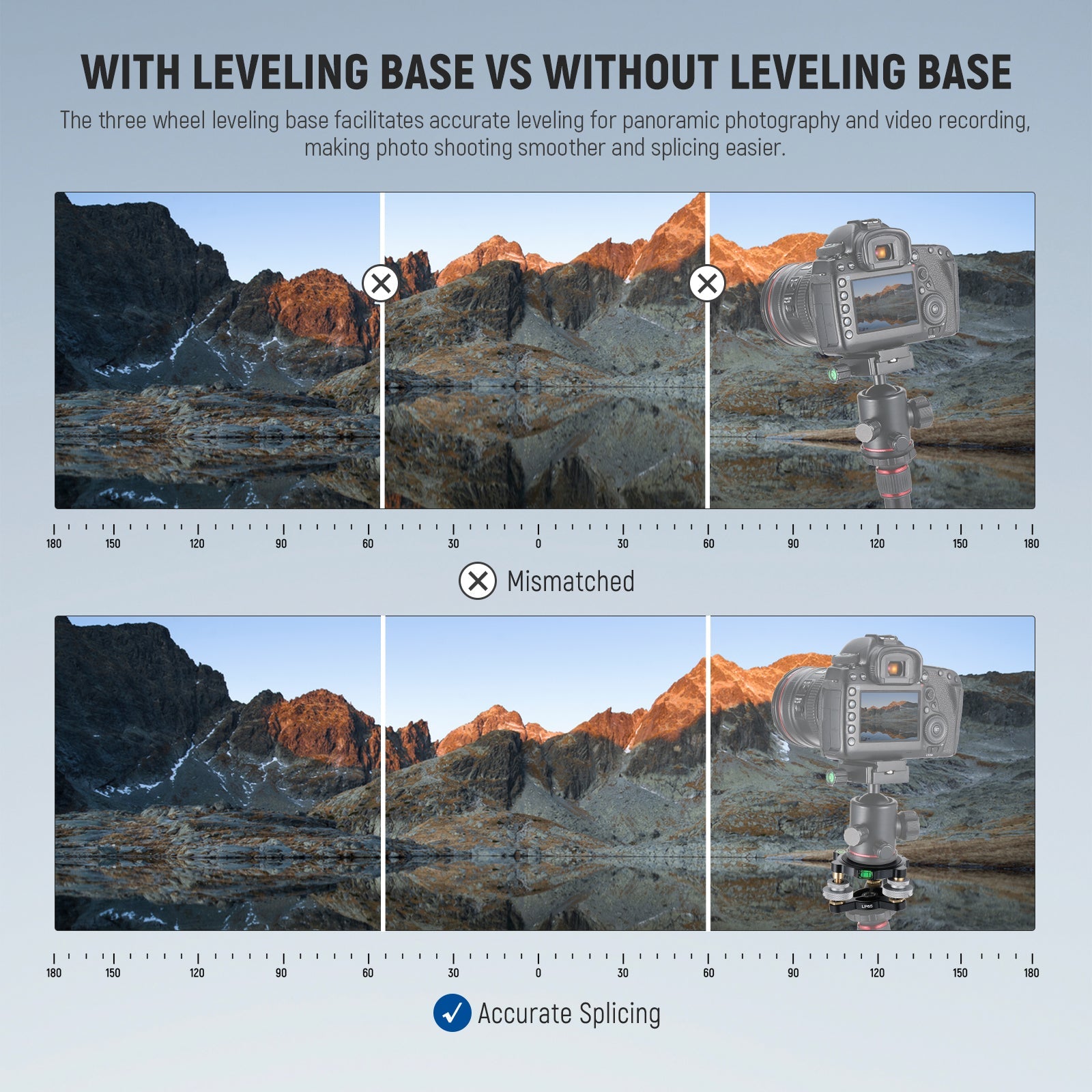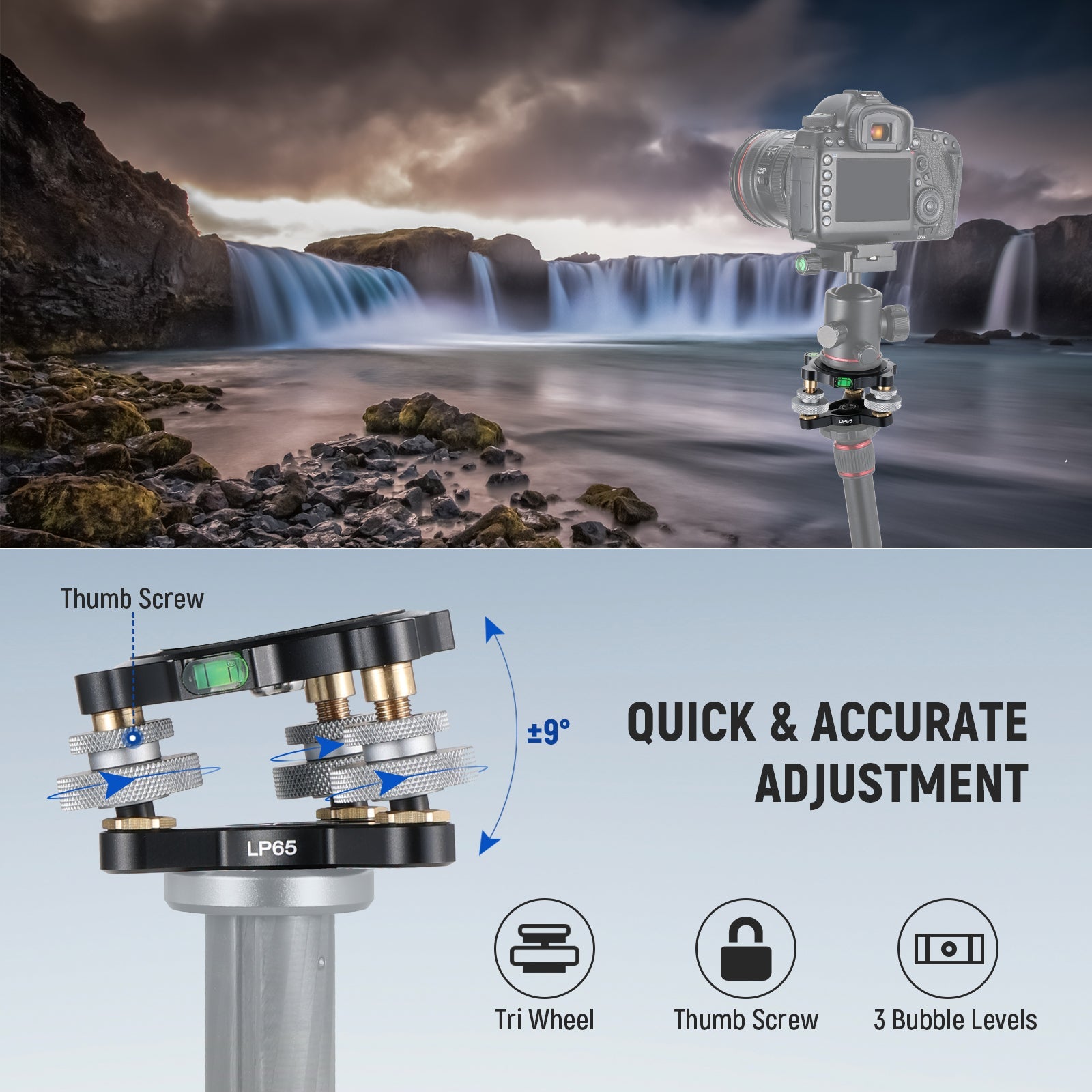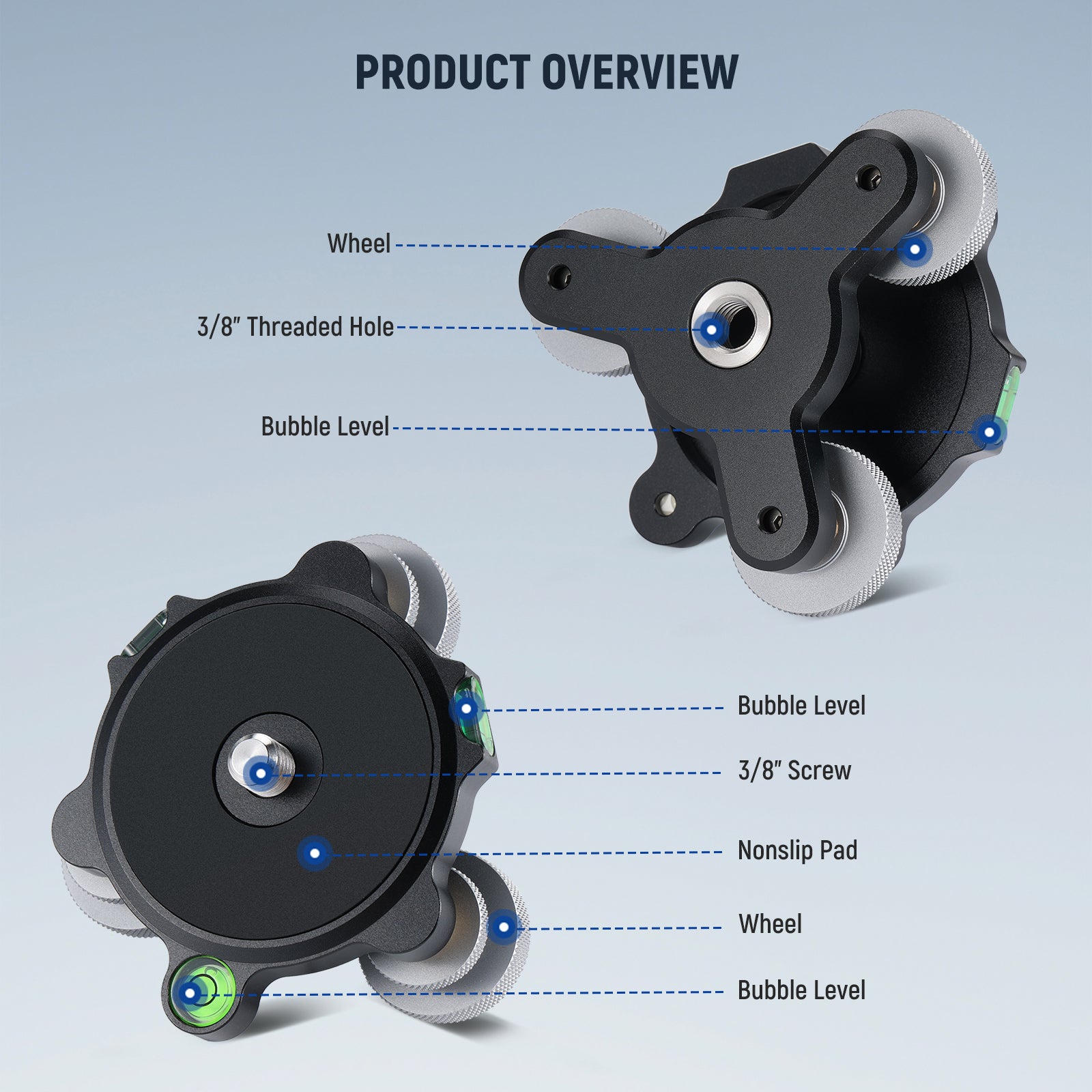- Tripod Leveling Base with Bubble Level- The tripod leveling base features three short support pillars that provide up to +/-9° leveling adjustments with thumb screws. The built in bubble levels help check the camera level at a glance and always keep it straight. The bottom 3/8" threaded hole can be attached to a tripod, monopod, slider, etc.