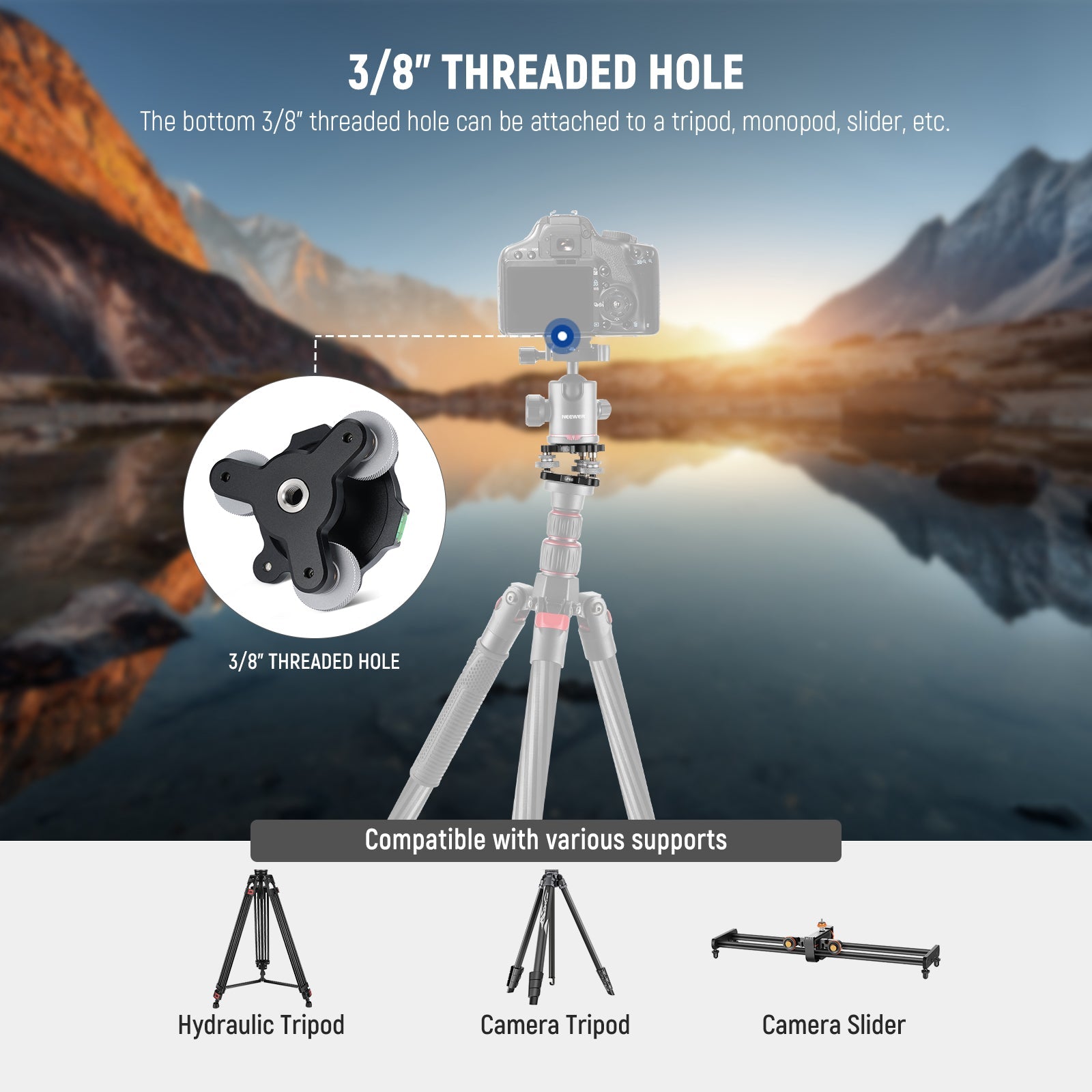 - Wider Compatible 3/8" Screw- The top 3/8" screw is for mounting ball heads, pan and tilt heads, fluid heads, gimbal heads, geared heads and other tripod heads, compatible with Sony Canon Nikon and other DSLR cameras. The nonslip rubber pads add stability and prevent your equipment from scratches
