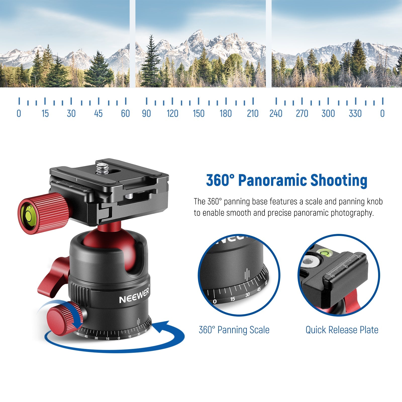 - Flexible Movement with Panoramic Head- Featuring a 360° panning scale with precise calibration and pan lock, this tripod head supports panoramic photography while securing your camera to a tripod. The swivel ball head easily tilts for different-angle shooting, whether vertical, horizontal, or overhead.