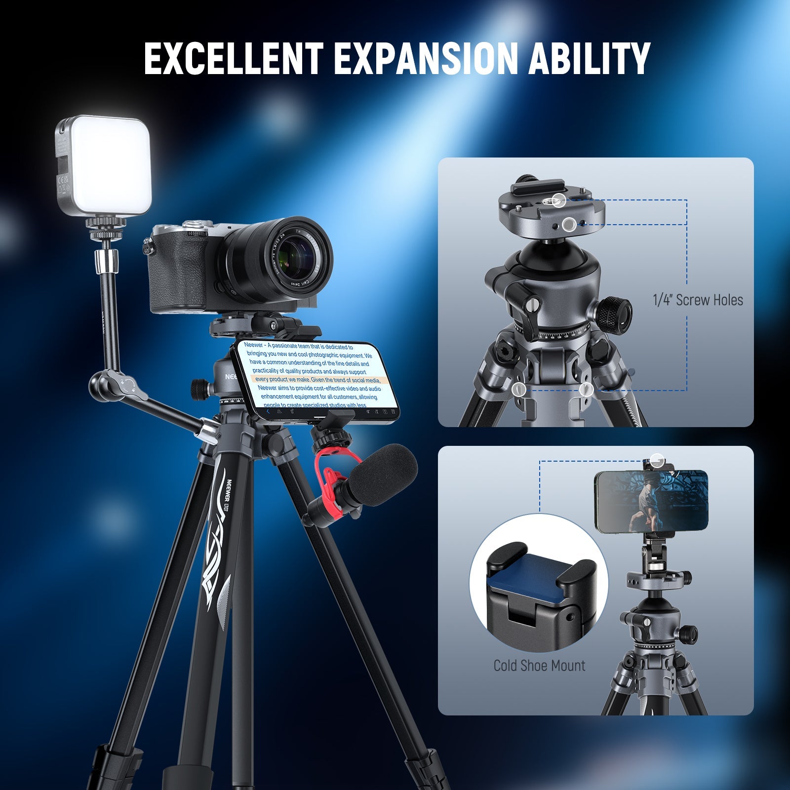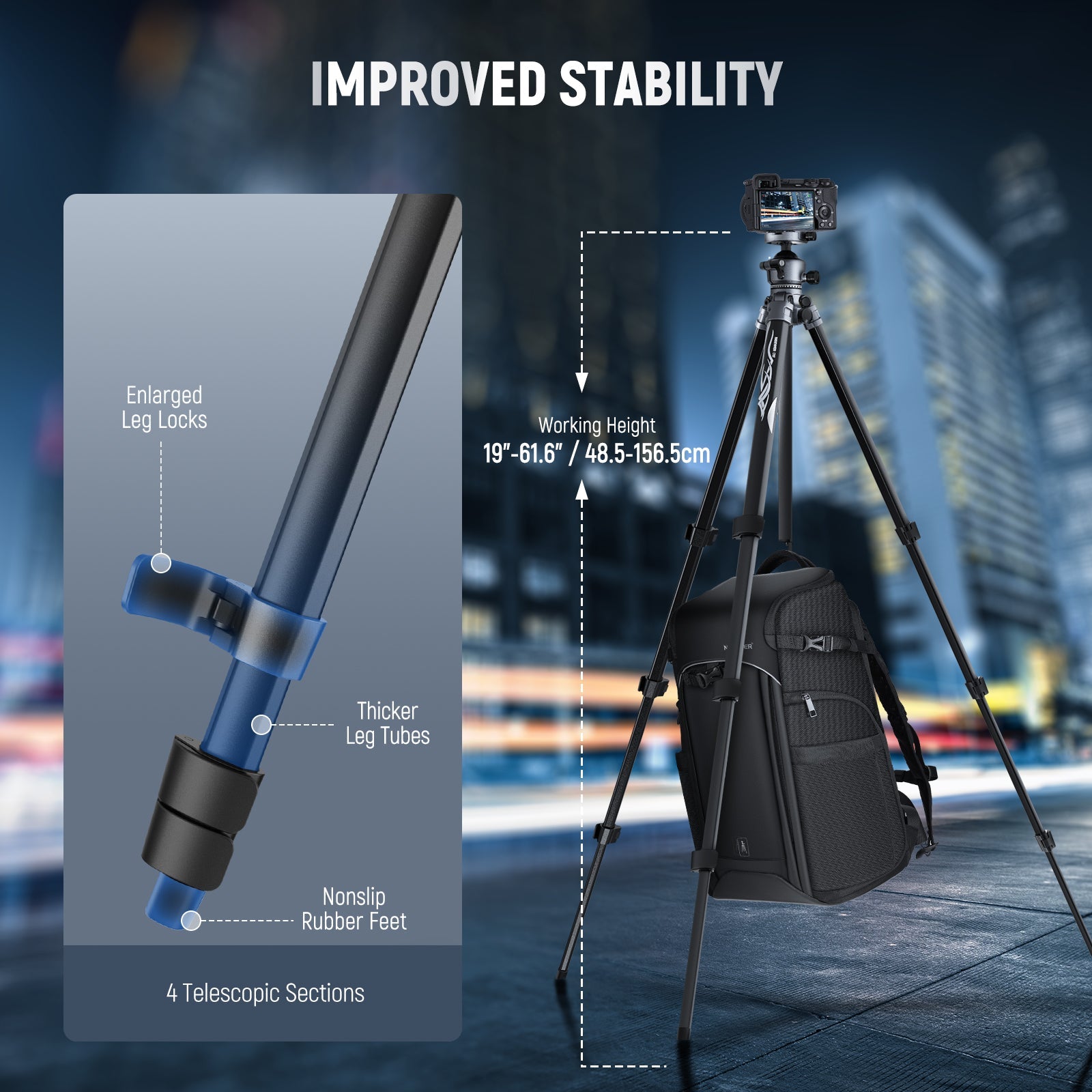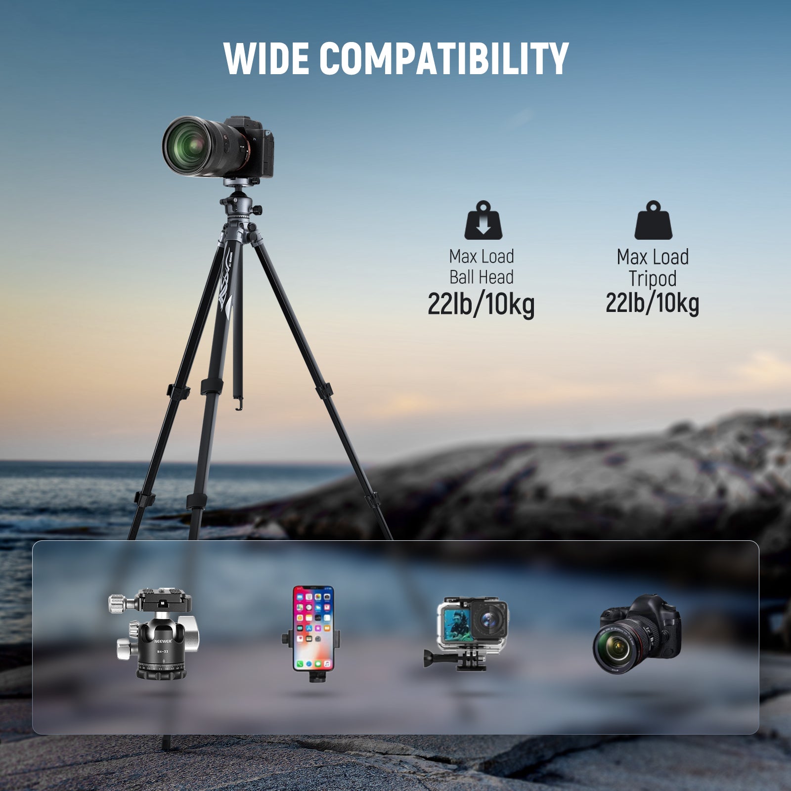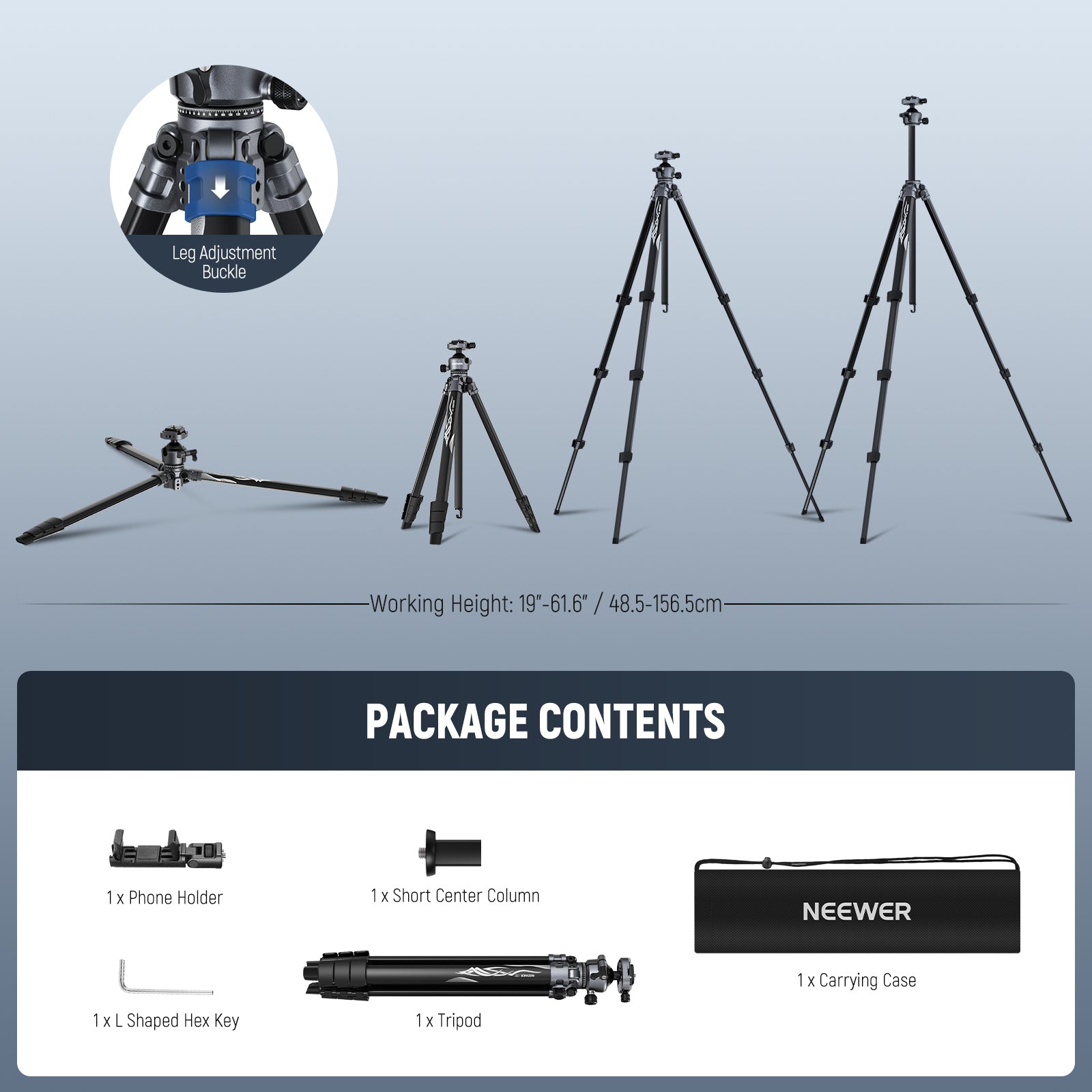 - Superior Stability Compact Travel Tripod- Crafted from aluminum alloy, this LT07 portable camera tripod weighs just 2.9lb/1.33kg and heavy duty to support up to 22lb/10kg. Tightly fitted legs fold down to a 2.2"/5.7cm diameter and 20.5"/52cm length for easier single hand grip, with 4 section tube legs for adjustable height (19"/48.5cm to 61.6"/156.5cm) and 3 fixed opening angles (22°, 55°, and 85°). The non slip rubber feet ensure stability and with a storage bag for easy transport