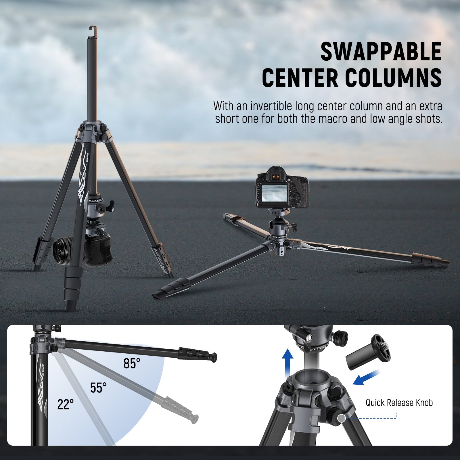 - Versatile Swappable Center Columns- This LITETRIP 07 professional camera tripod offers versatility with a long center column and an extra short column, both invertible for macro or lower angle shots, with the short column enabling low level shooting from as low as 2.75"/7cm. Manual tightening knobs enhance safety and stability. The longer column features a handy hook for added weight and balance