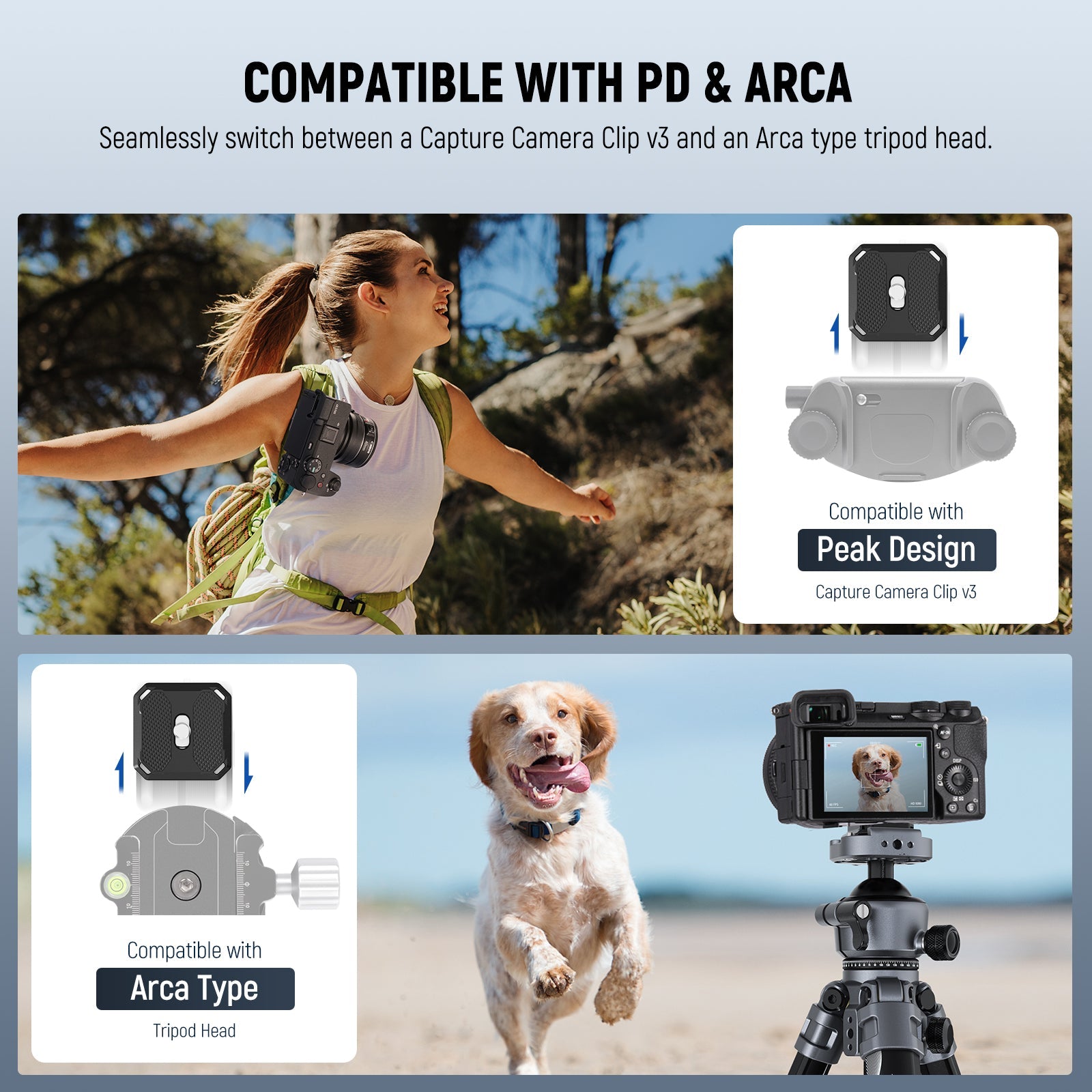 - Arca Type Dual Compatibility QR System- The versatile Arca type QR plate and clamp base are also compatible with Peak Design Capture Camera Clip V3 backpack strap clip mounts and other Arca Type plates. The top 1/4" screw is compatible with mini DV camcorders, DSLRs, mirrorless cameras, binoculars, sliders, smartphones and more