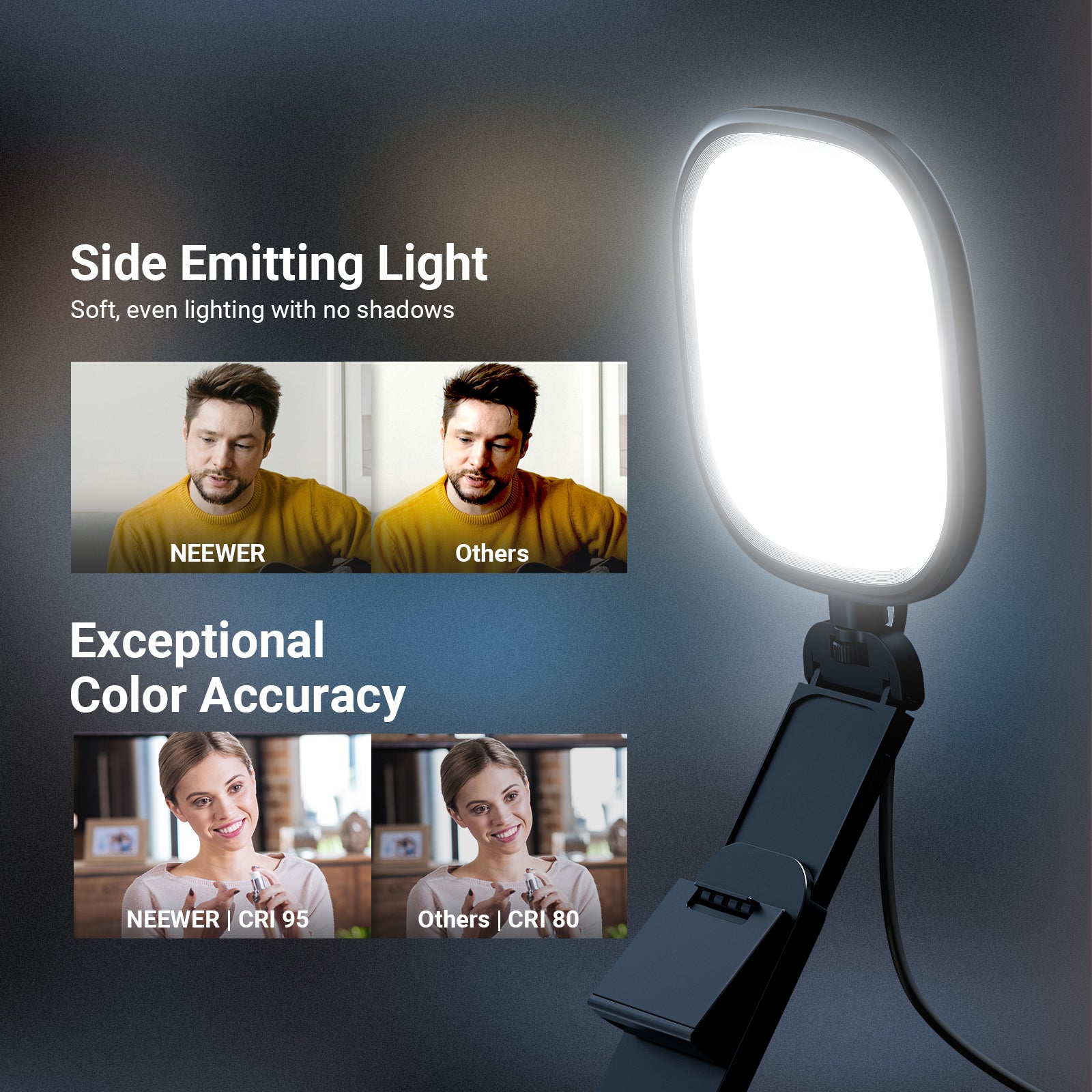 Adjustable Light- NEEWER NL10 monitor light is equipped with120 bi color LEDs for up to 656lux/0.5m, offering 5 CCT modes and 10 brightness levels to flatter all skin tones and suit various desk video lighting needs. The memory function auto recalls your last used color temperature and brightness settings. A USB A to USB C adapter is included