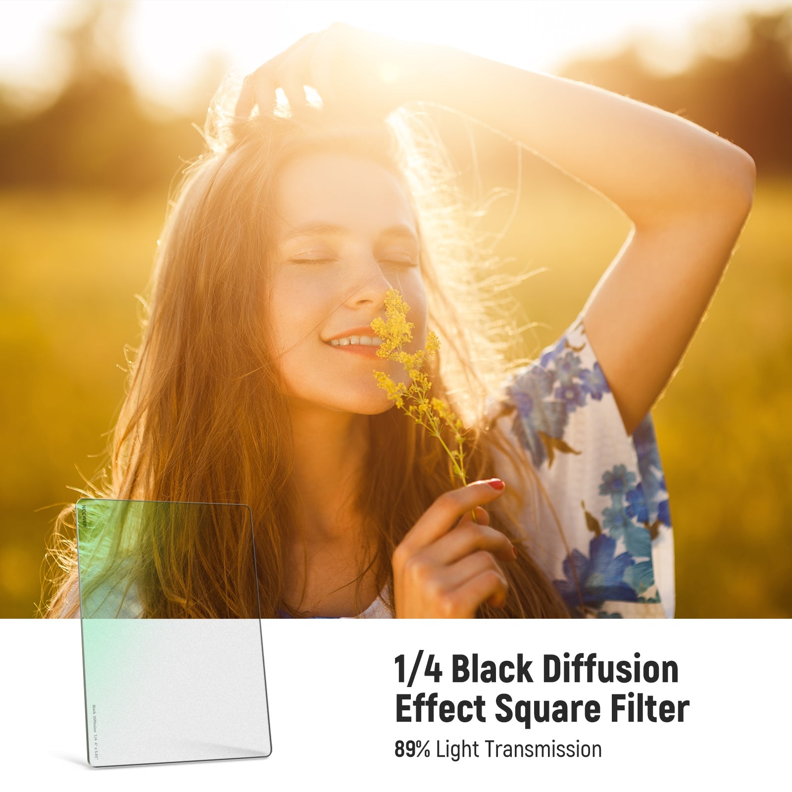 - 1/4 Black Diffusion Filter for Cinematic Effect-The 1/4 stop black diffusion filter effectively reduces highlights and lowers glare to deliver smoother and softer skin tone for a dreamy cinematic effects on video and photo images. Ideal for portrait photography, video recording, and vlogging