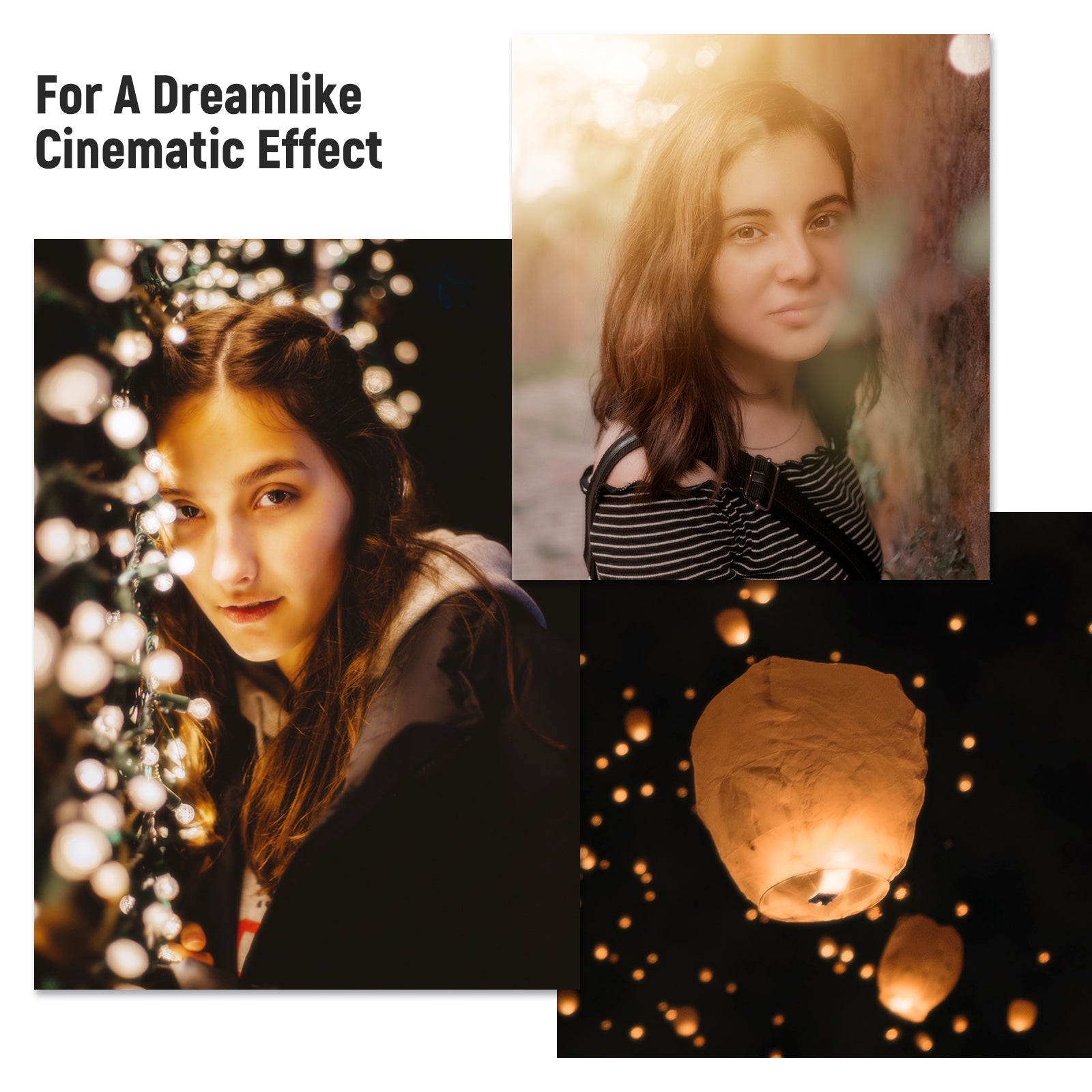 - 1/4 Black Diffusion Filter for Cinematic Effect- Featuring great light transmittance, the black diffusion 1/4 filter effectively reduces highlights and lowers glare for a soft cinematic effect on video and photo images. Well suited for portrait photography, as it helps soften wrinkles, blemishes, and pores while maintaining skin tone values