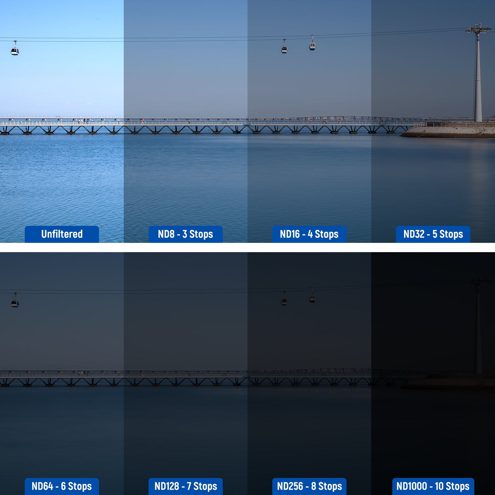 - Control Exposure & Reduce Reflections- The ND/PL filters offer a convenient solution by combining neutral density (ND) and polarizing (PL) filter functions into a single unit. ND8/PL ND16/PL ND32/PL ND64/PL reduce light by 3, 4, 5, and 6 stops respectively, permitting precise exposure control in different lighting conditions. The ND/PL filters avoid overexposure, minimize glare and reflections from nonmetallic surfaces such as water and glass