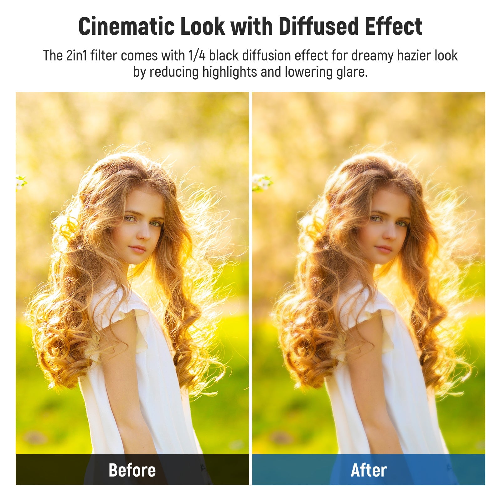 - Cinematic Look with 1/4 Black Diffusion Effect- The filter also comes with black diffusion 1/4 effect for dreamy hazier look by reducing highlights and lowering glare. It helps make skin look smoother in portrait photography