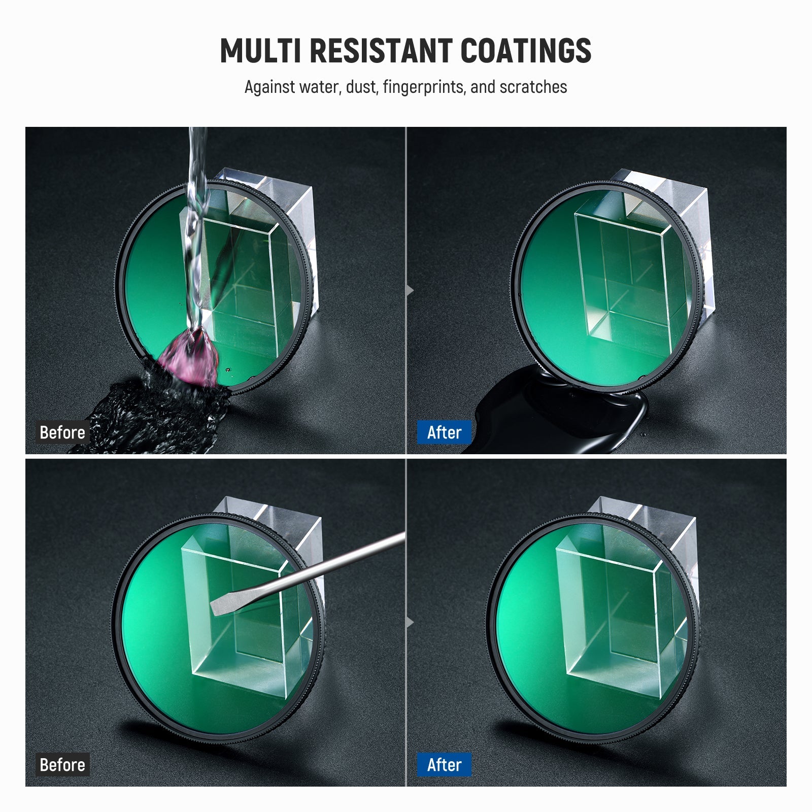 - Multiple Protective Coatings- Multiple coatings on both sides of the glass resist water, dust, fingerprints, and scratches. An included cleaning cloth helps keep the filter spotless