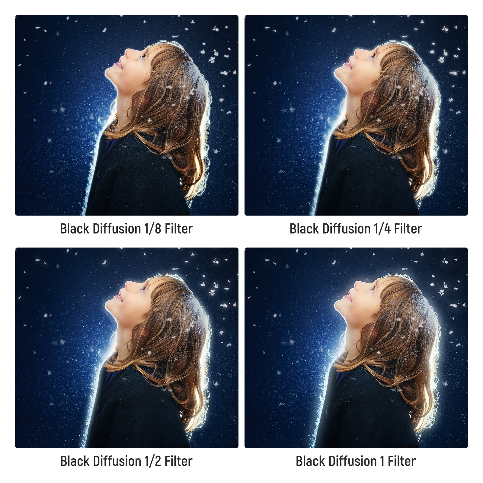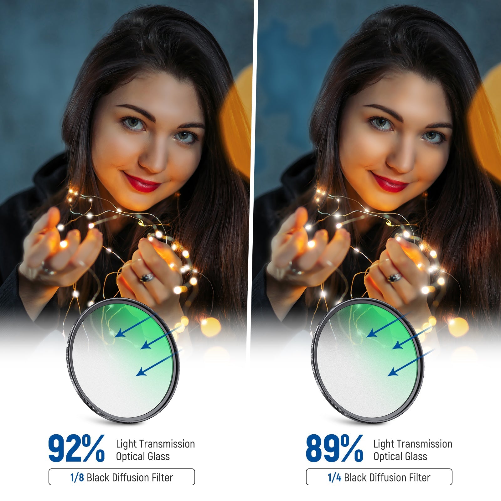- 1/4 & 1/8 Black Diffusion Filter Set- 1/4 and 1/8 black diffusion filters deliver smooth skin tones, soften highlights, reduce glare, and create a dreamy, hazy, and cinematic effect for portrait photography, video recording, and vlogging