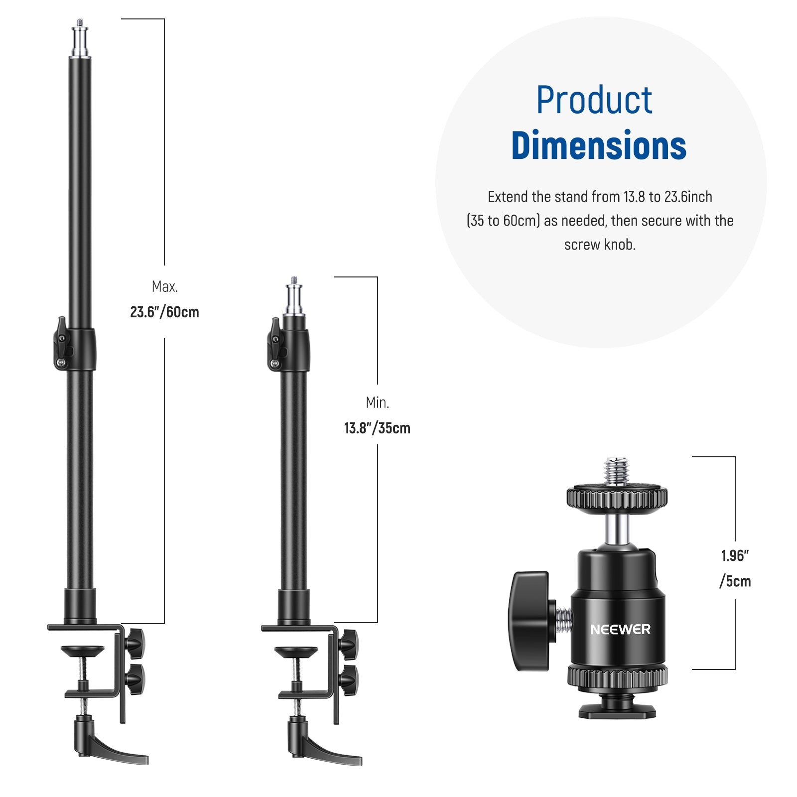 - 1/4” Ball Head & Hot Shoe Adapter- This desktop C clamp stand with a top 1/4” screw and the mini ball head and detachable 1/4” hot shoe adapter allow you to easily install a microphone, LED video light, ring light, phone holder, field monitor, DSLR camera, camcorder, digital camera, or a wireless flash trigger on your desk.