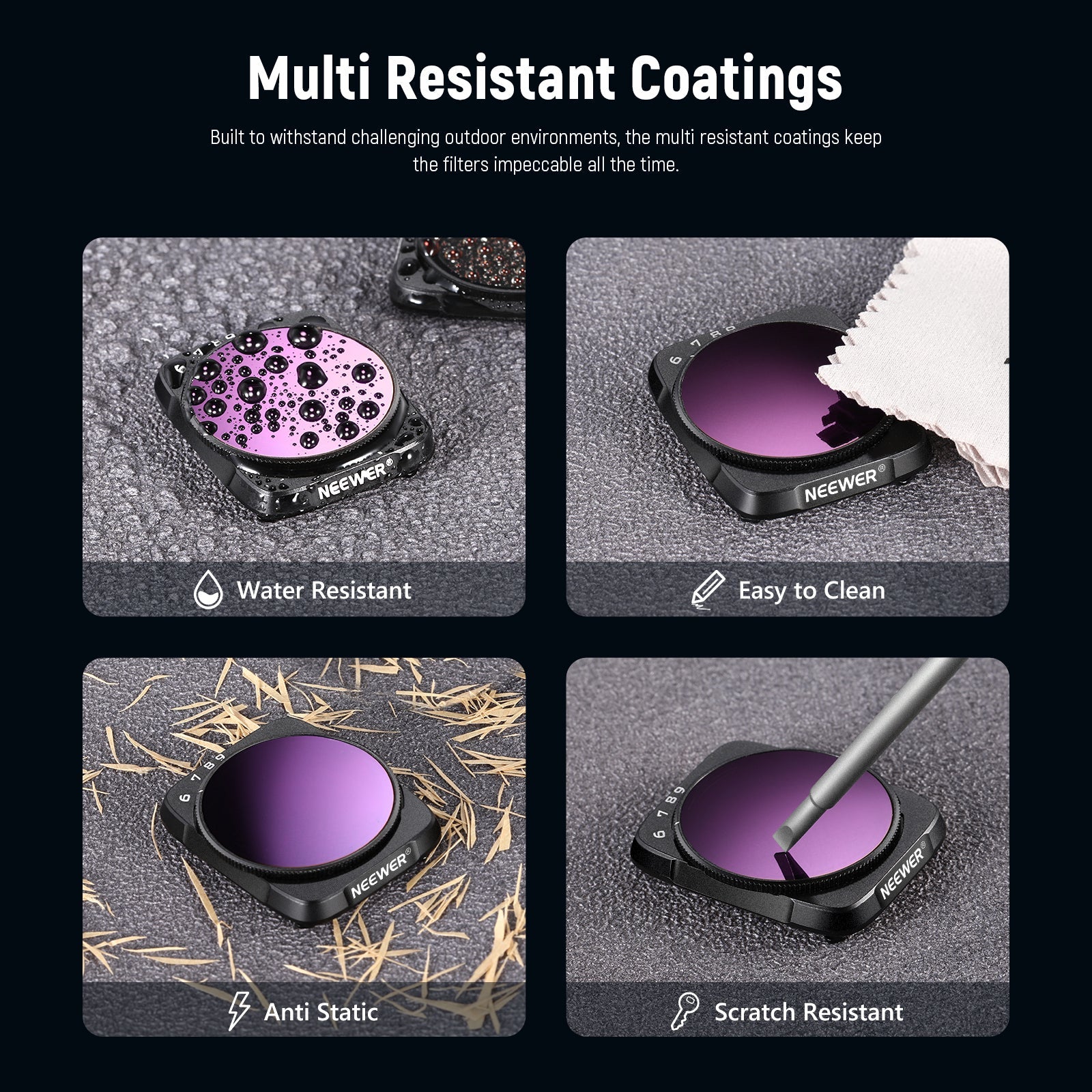 - Variable Neutral Density- Two variable ND filters offer light reduction from 2 to 5 stops and 6 to 9 stops, respectively. Use them in different light conditions to take your aerial shooting to the next level.