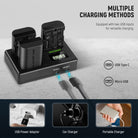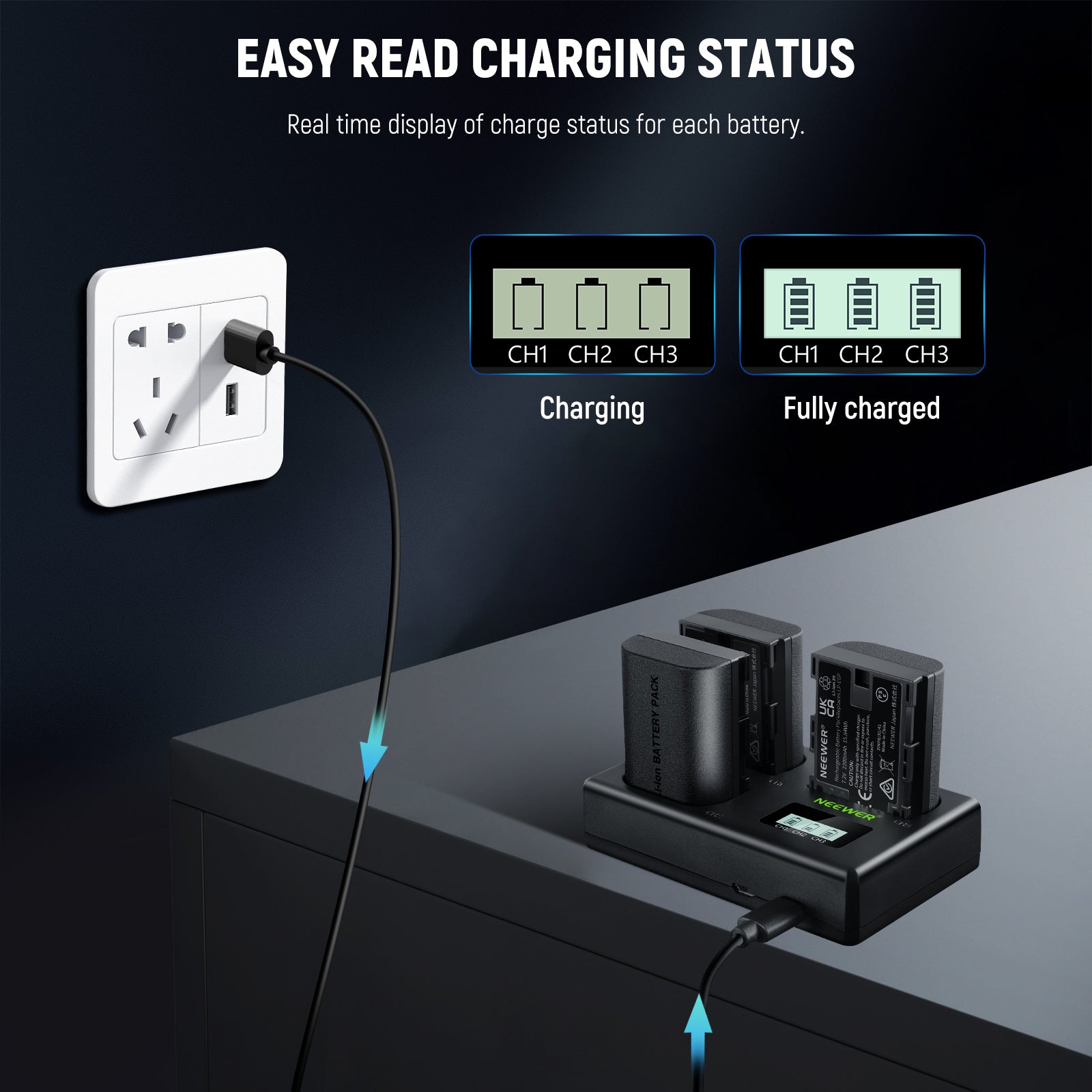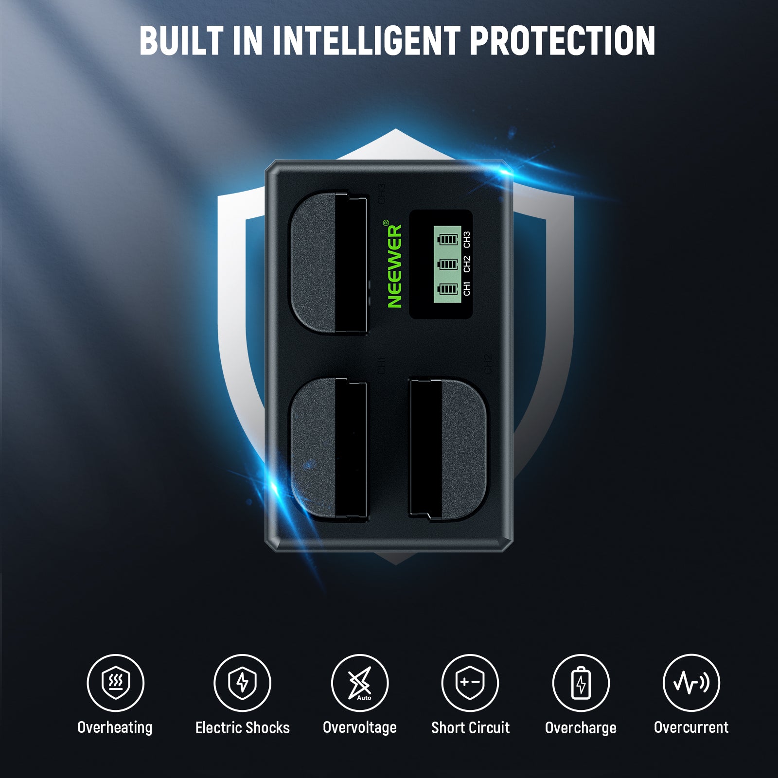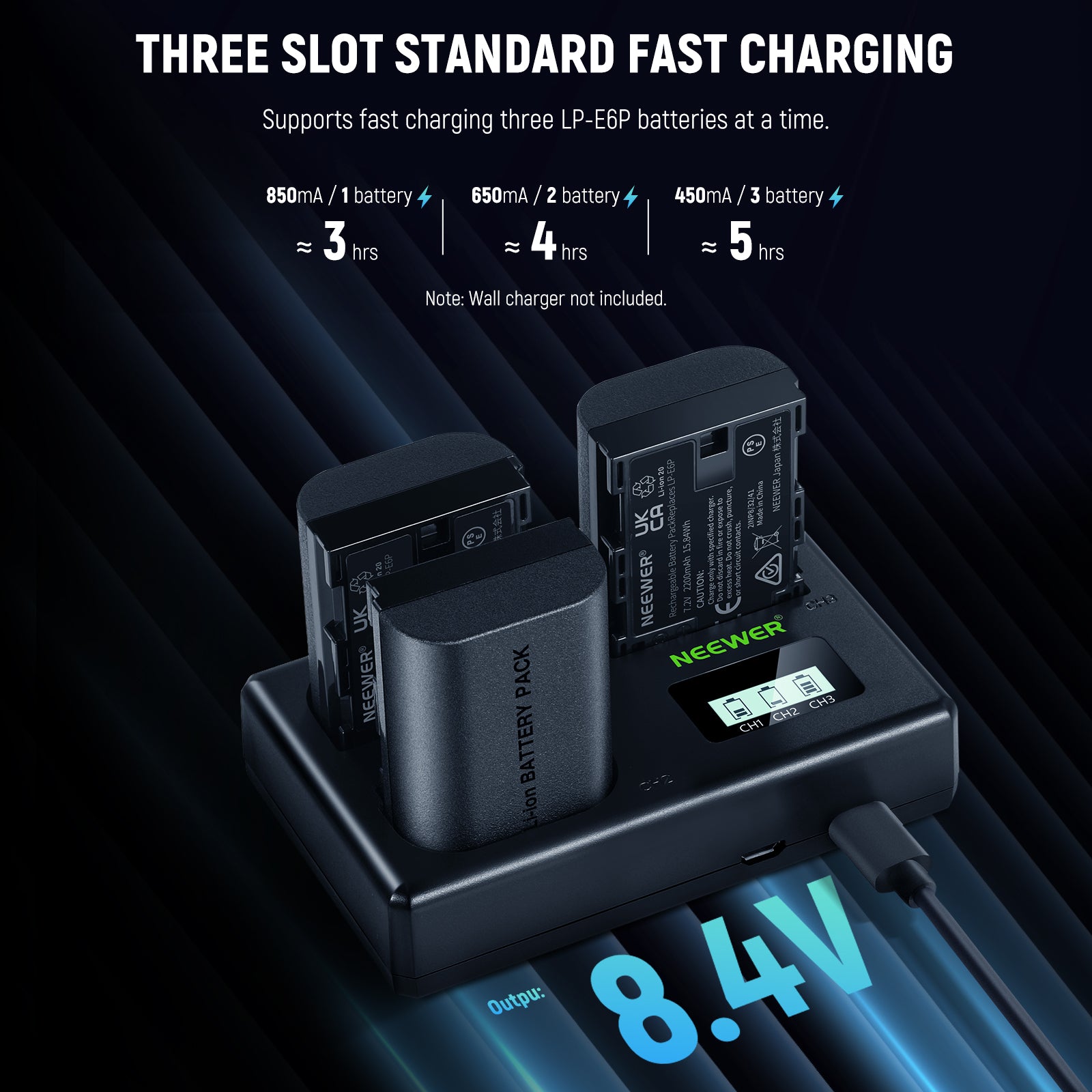 - Triple Slot USB Charger- The USB charger can simultaneously charge 3 LP-E6P batteries to full capacity in just 6.25 hours, significantly improving your shooting efficiency (supports original/NEEWER LP-E6P/LP-E6NH/LP-E6N/LP-E6 batteries). It features Micro USB and Type C dual input ports, allowing charging from a portable charger, car charger, or computer using the included USB A to USB C cable. An LCD display provides real time charging status