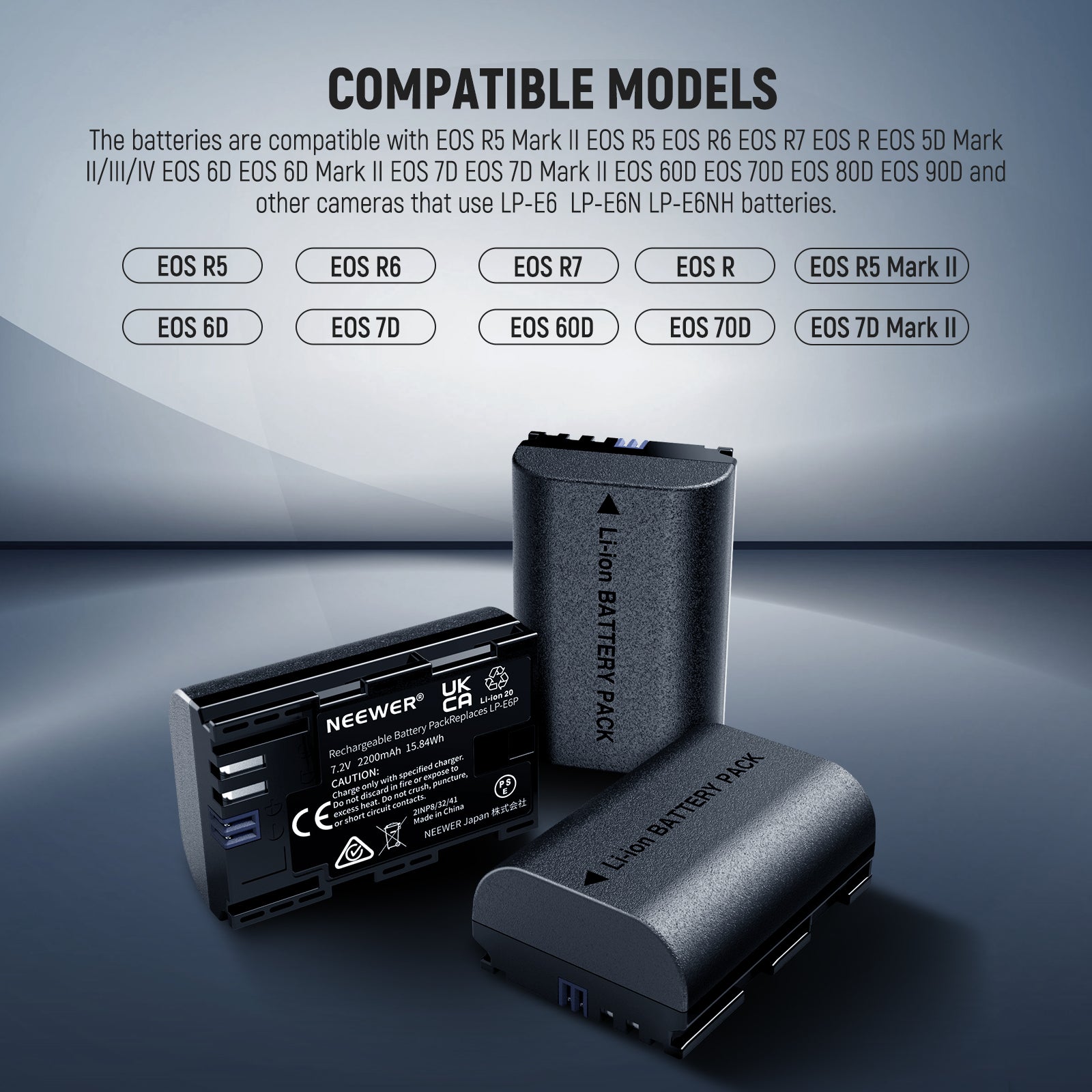 - Fully Compatible with Canon Cameras Powered by LP-E6P Battery- NEEWER newly upgraded LP-E6P replacement battery is fully decoded as a professional alternative to the original LP-E6P/LP-E6NH/LP-E6N/LP-E6 models. It features an impressive 6A max continuous discharge current, effortlessly powering the latest EOS R5 Mark II, seamlessly compatible with Canon EOS R5 Mark II EOS R5 EOS R6 EOS R7 EOS R EOS 5D Mark II/III/IV EOS 6D EOS 6D Mark II EOS 7D EOS 7D Mark II EOS 60D EOS 70D EOS 80D EOS 90D