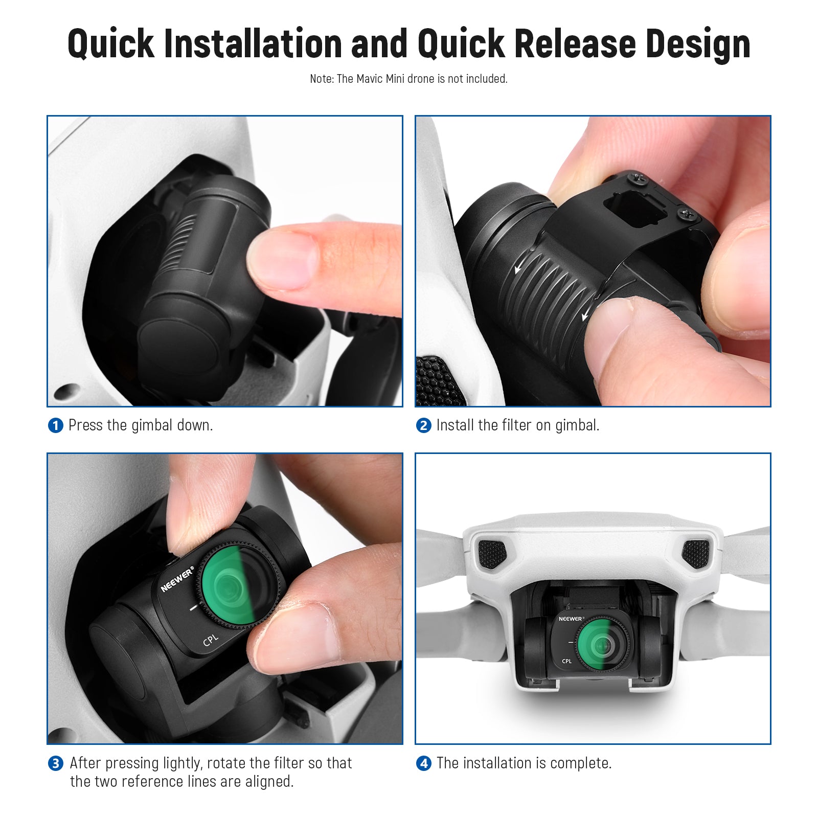 - Compatible with Mavic Mini/Mini 2/Mini SE- NEEWER 3-pack ND8+ND16+CPL Lens filter set is specifically designed for the DJI Mavic Mini/Mavic Mini 2/Mini SE camera. Take this kit with you anywhere go in the convenient storage travel case provided. The package also includes 3x filters and a filter-cleaning cloth