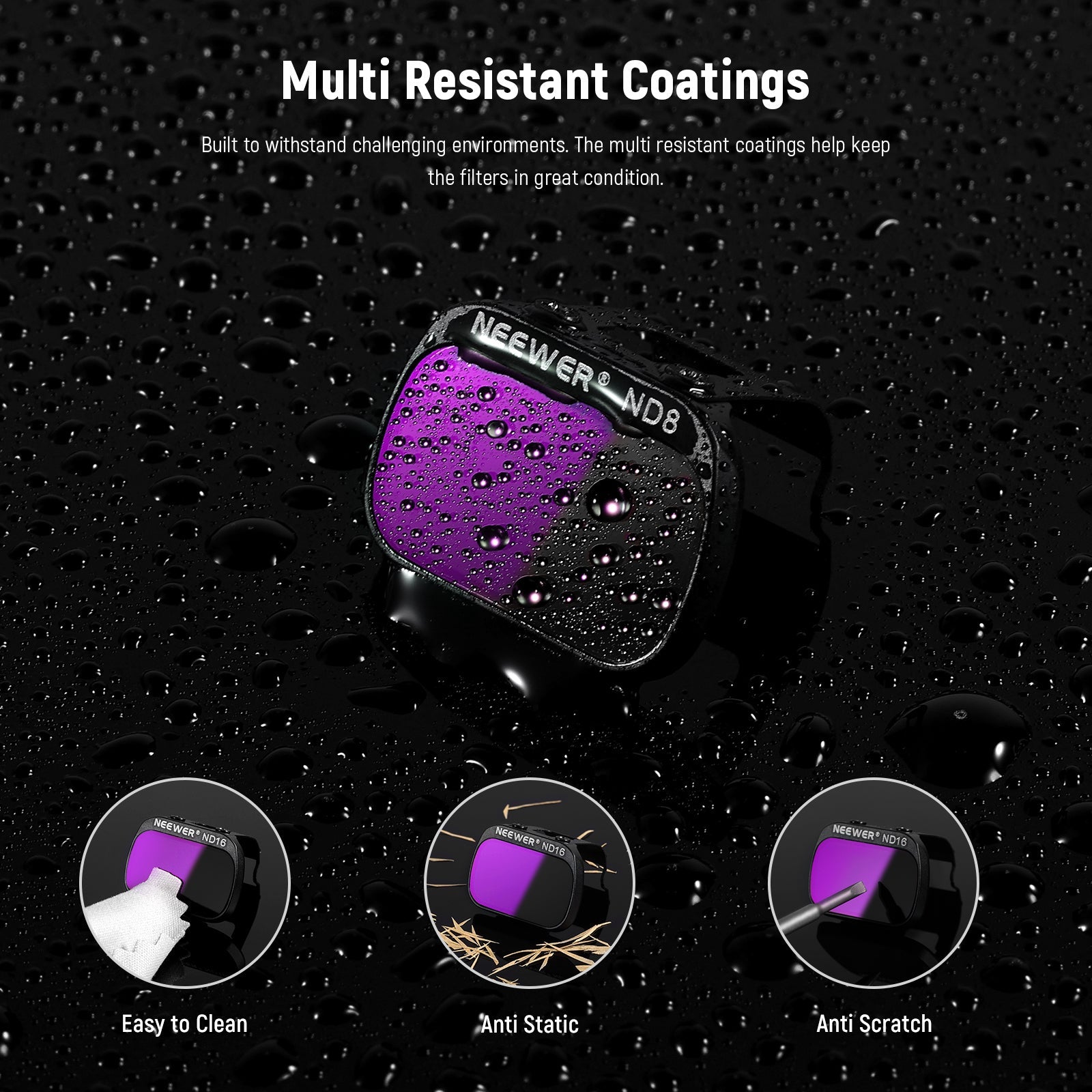 - ND8 & ND16 Filter- ND filters are designed to reduce the amount of incoming light and capture time exposures or blurred motion of objects. ND8 reduces the camera shutter speed by 3 stops and you can use it on partly cloudy days. The ND16 filter helps reduce the shutter speed by 4 stops and can be used in midday/medium sunlight.
