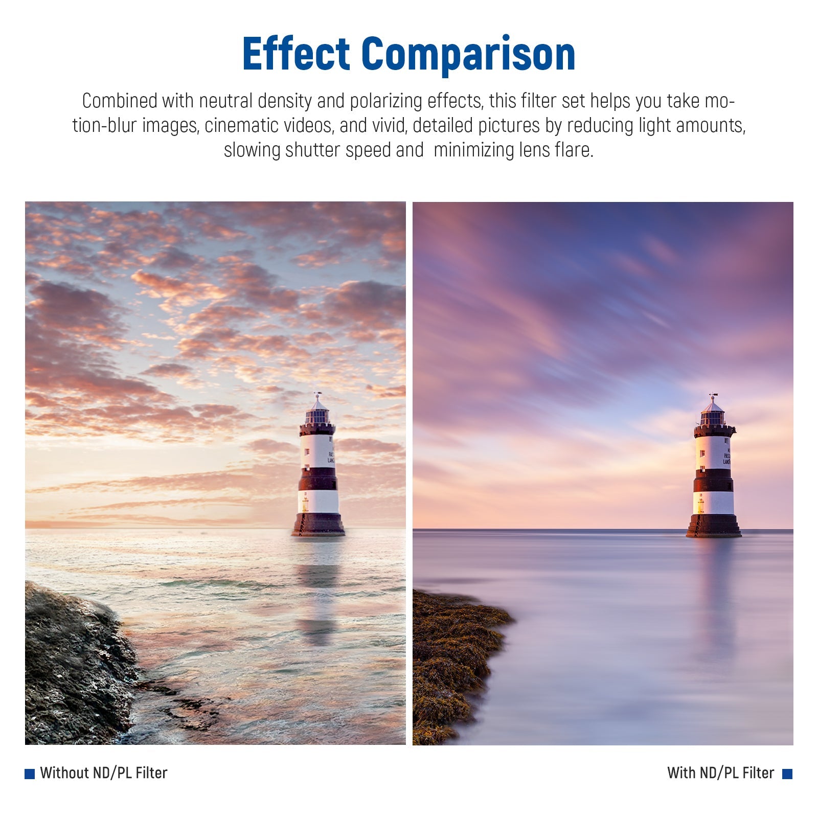 - GREAT FUNCTION: ND lens filters reduce the amount of light reaching the film without affecting the color; ND8 reduces the exposure by 3-stops; ND16 reduces the exposure by 4-stops; ND32 reduces the exposure by 5-stops; ND64 reduces the exposure by 6-stops; ND/PL filters can remove unwanted reflections when capturing cinematic video