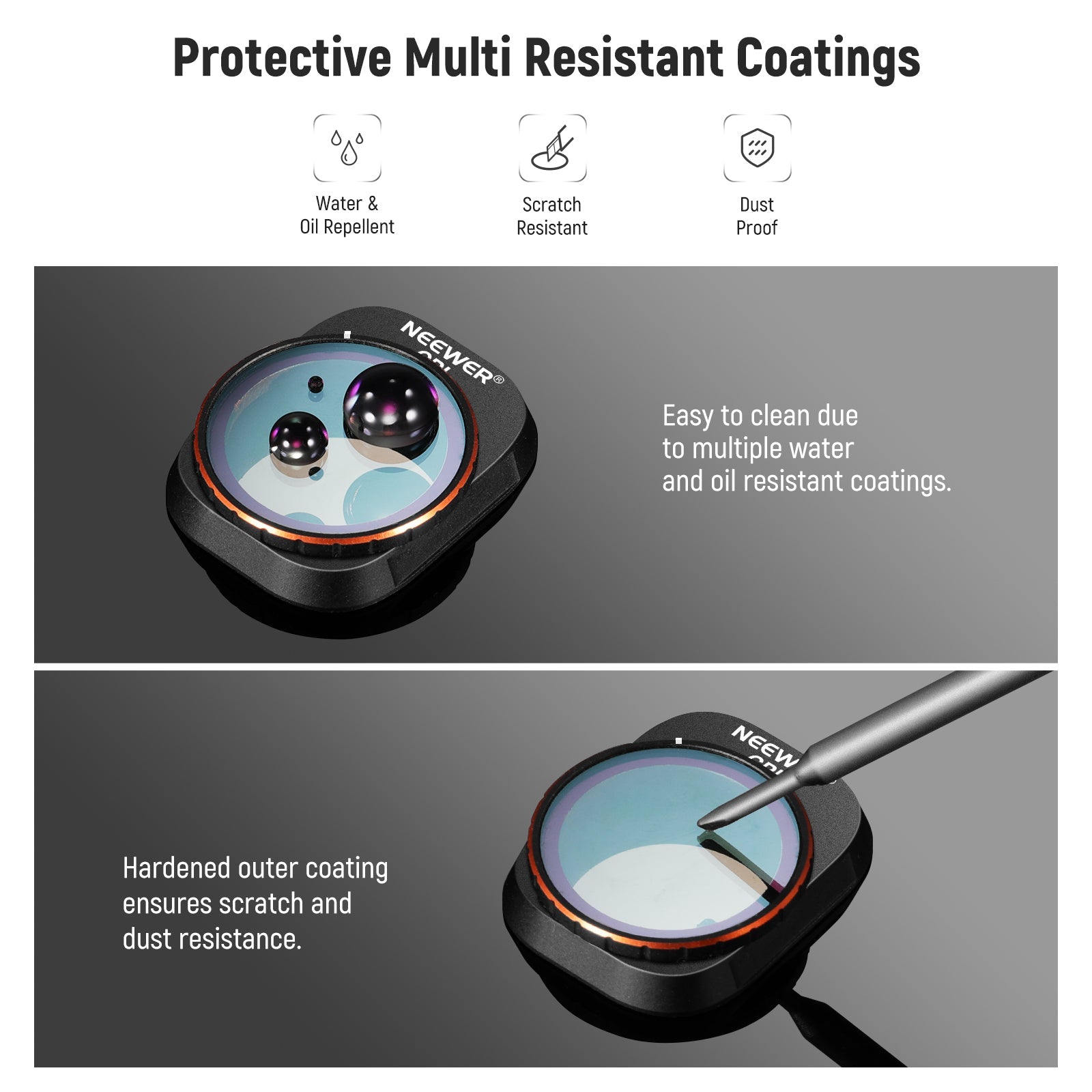 - Both Side Multi-Coated HD Optical Glass- With 30 layers of multi functional coatings on both sides of the HD optical glass, these filters are water repellent, scratch resistant, and oil proof, ensuring long-lasting optical quality in challenging environments