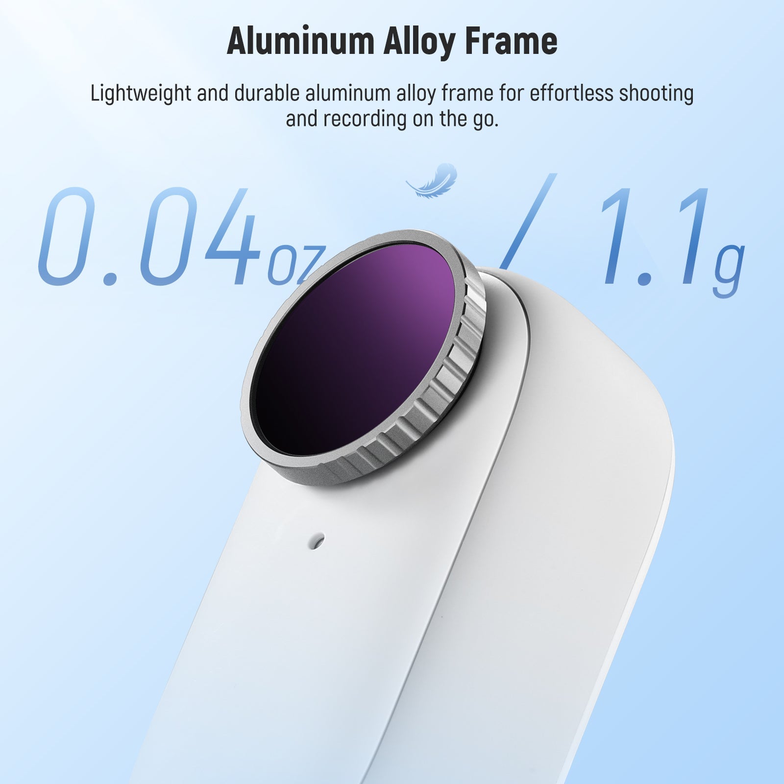 - Quick & Easy Installation- Remove the original lens protector and twist on for quick installation. The aluminum construction of the filter frame ensures durability, with a lightweight design of just 0.04oz/1.1g. The black anodized threads and patterned knurls allow for effortless setup and precise rotation