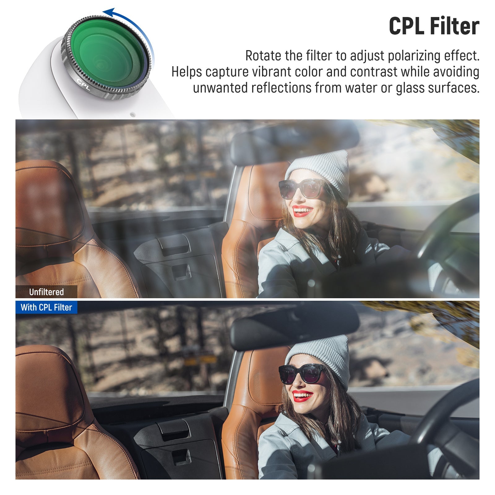- Vivid Color Reproduction CPL Filter- Rotate the included CPL filter to add vibrancy to your travel or sports vlogs. It helps to reduce glare and unwanted reflections from surfaces such as water, glass, and metallic objects, which will enhance the color and clarity of your shots, resulting in sharper and eye-catching images and videos