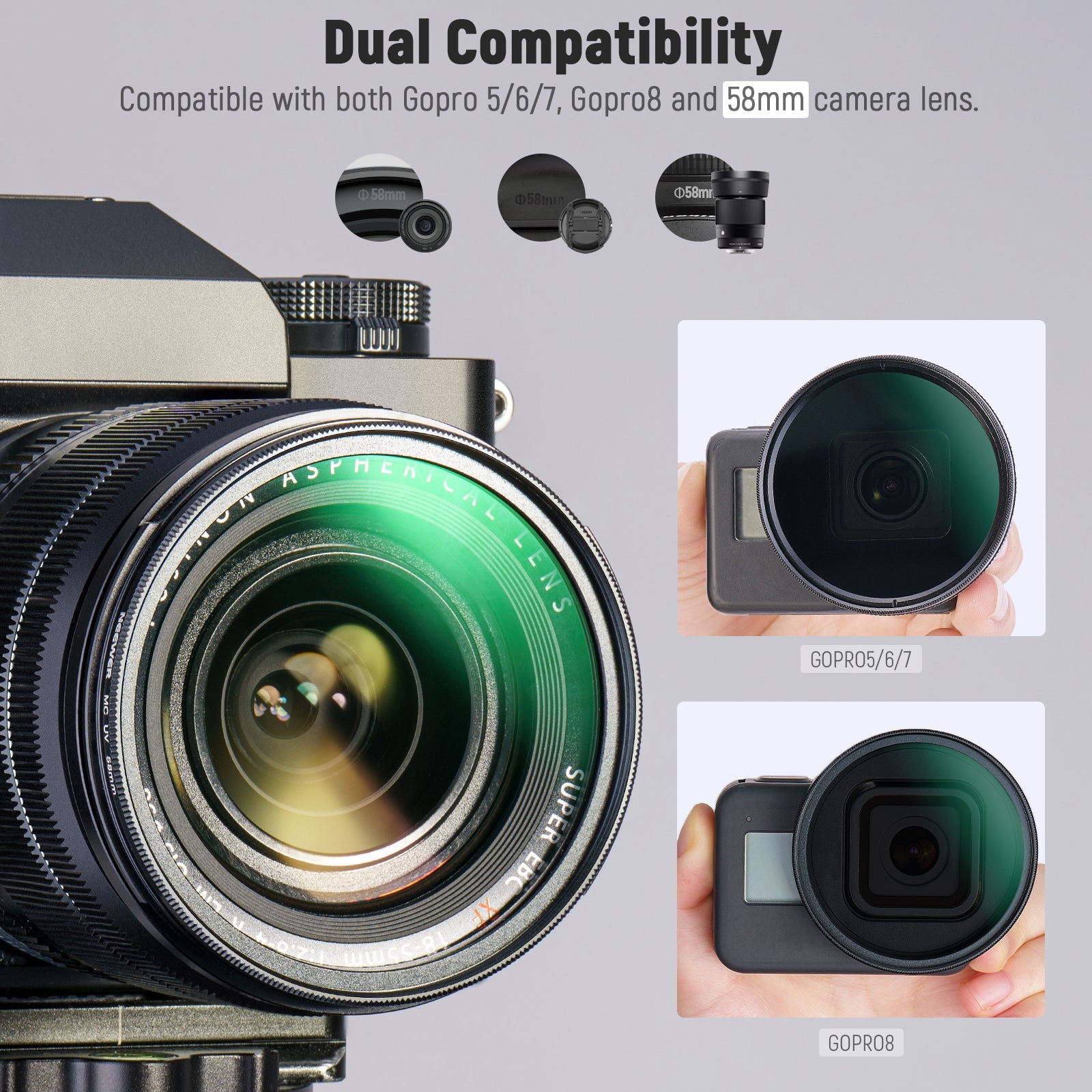 - Dual Compatibility- This ND/CPL/UV lens filter kit serves a dual purpose of being both 58mm camera lens filters and the action camera filters compatible with GoPro accessories Hero 5/6/7/8 (converted with the included adapter rings). Please confirm the “Ф58mm” lens thread size marked under your camera lens barrel