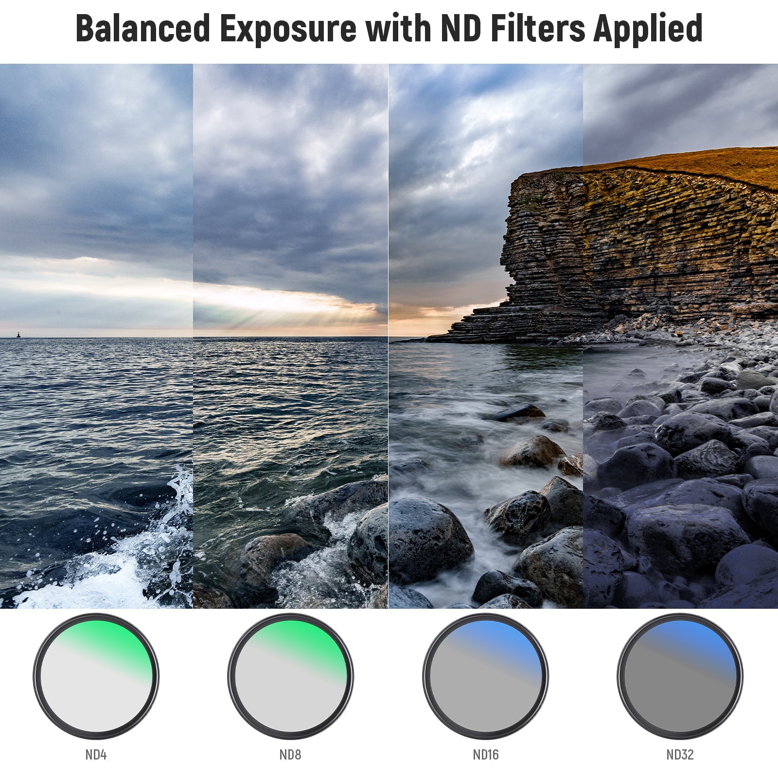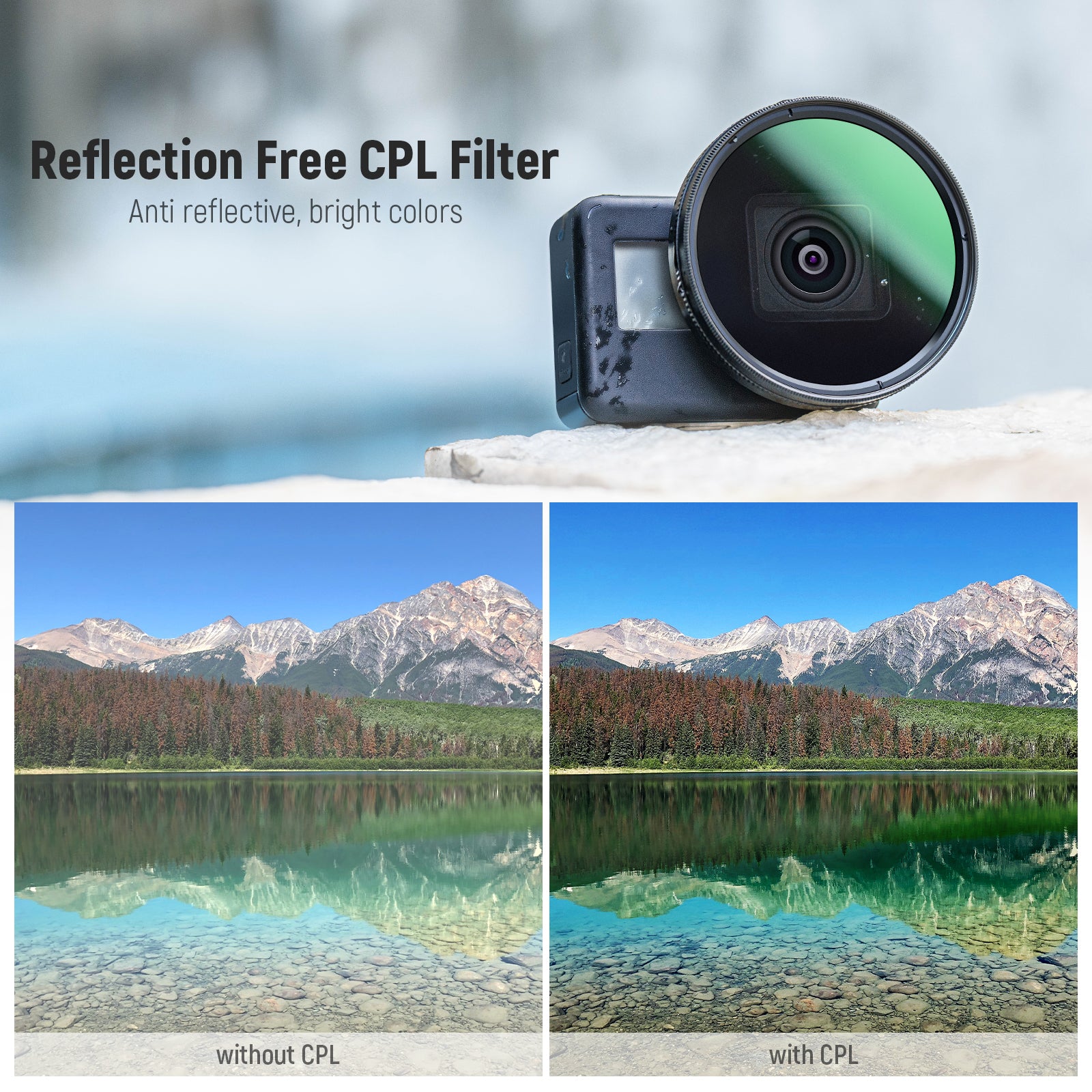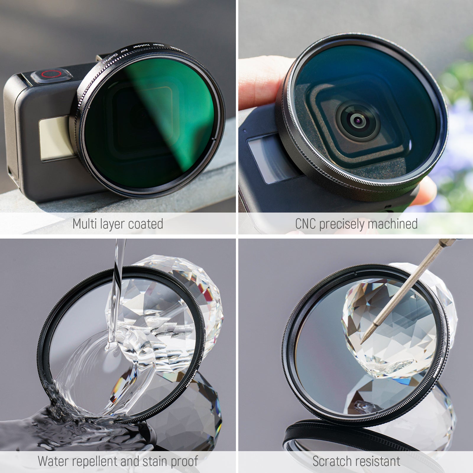 - Various Filtered Effects Available- The neutral density ND4/ND8/ND16/ND32 filters help avoid overexposure by reducing light by 2, 3, 4, and 5 stops, recommended for filming outdoors under bright daylight. Also applicable to long-exposure shots. CPL filter is used to darken skies and manage reflections and glare from nonmetallic surfaces. The UV filter blocks ultraviolet rays and eliminates the bluish cast in images. Choose one to achieve your desired effect without compromising image clarity