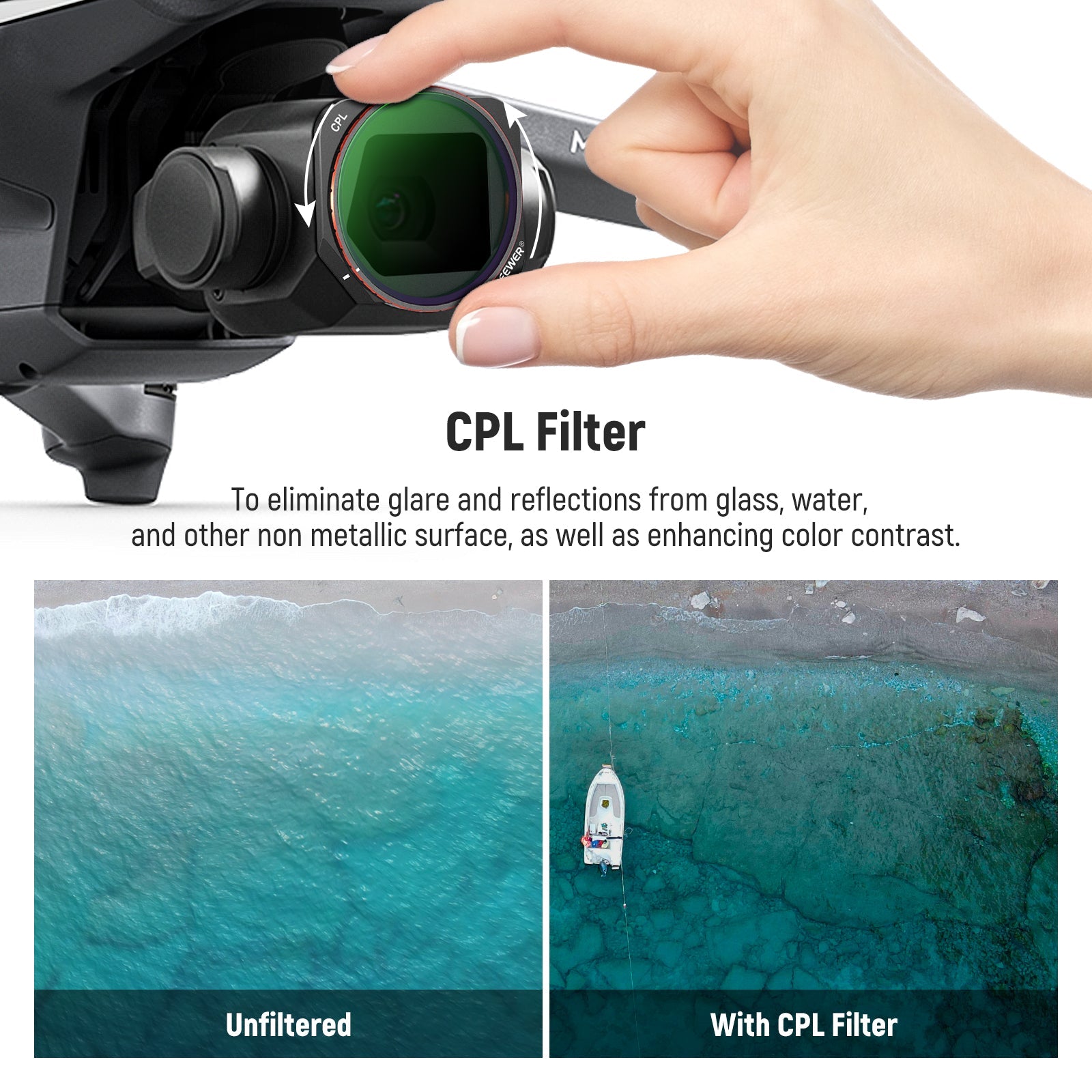 - Vivid Color Reproduction- This drone accessory kit also includes a CPL filter to eliminate glare and reflections from glass, water, and other nonmetallic surface, as well as enhance color contrast. Use the CPL filter to get vivid pronounced colors on your image, such as blue sky and white cloud, especially recommended for landscape and travel photography