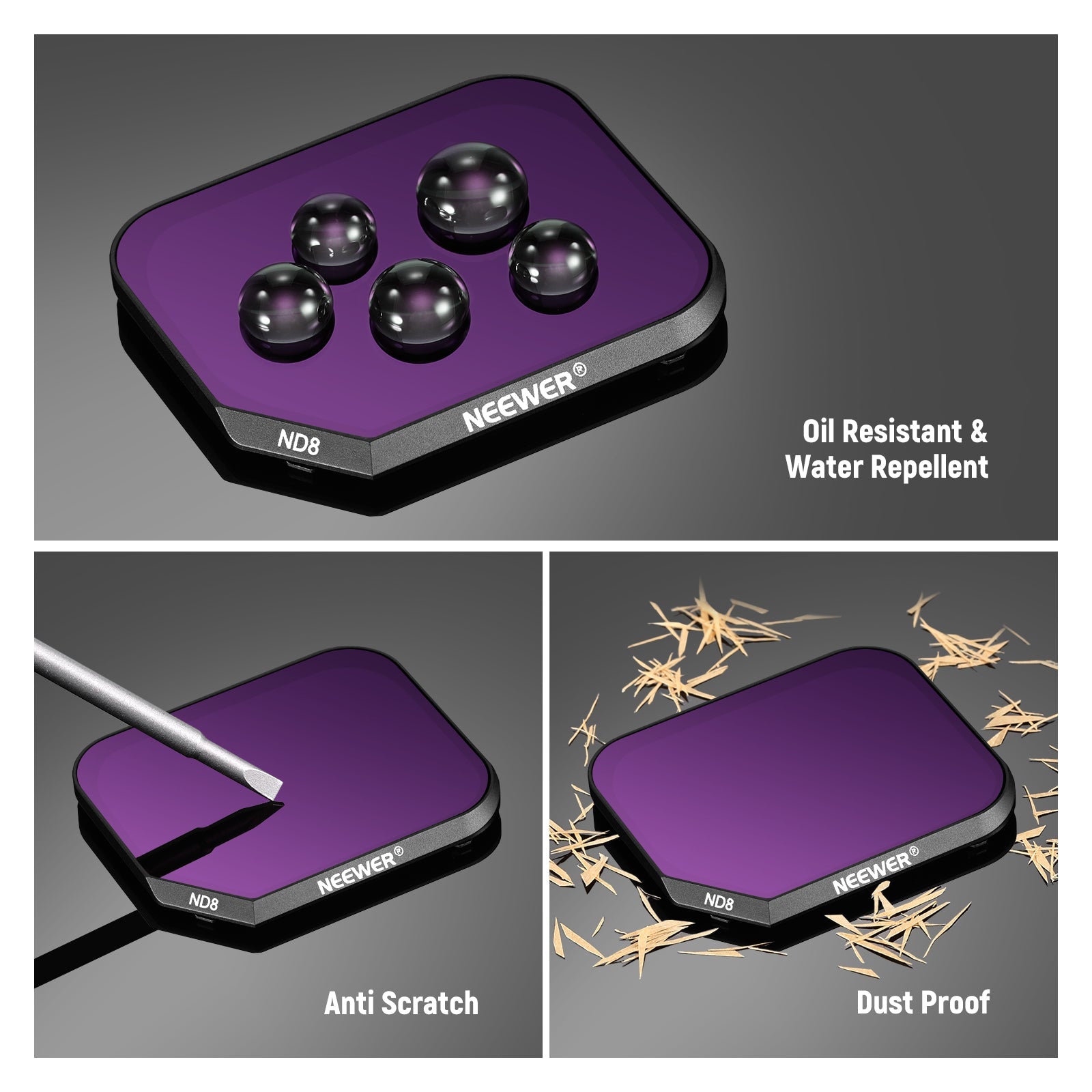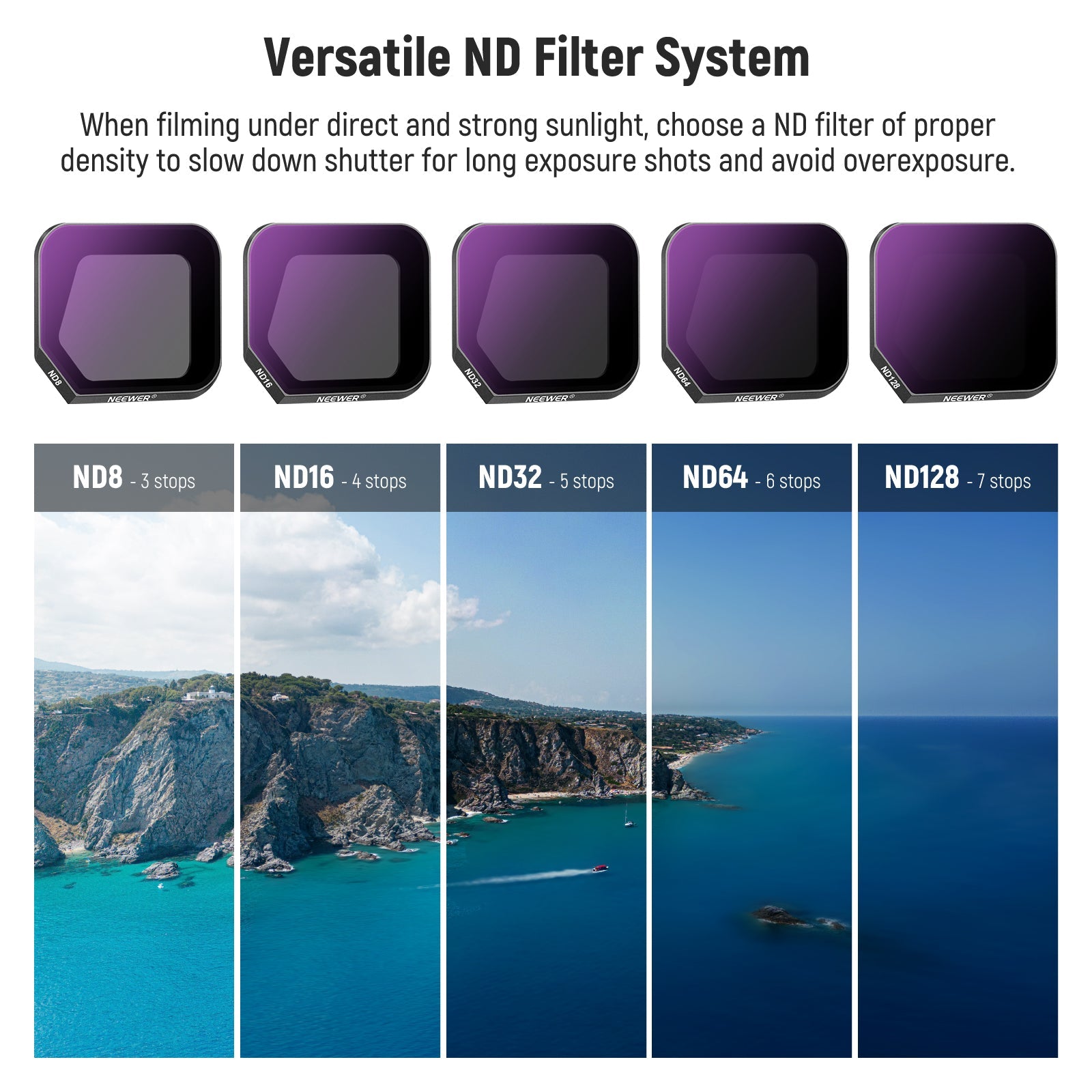 - Versatile ND Filter System- The ND filters help deliver smooth and clean video footage with clear images by controlling the amount of light reaching the drone lens with the ND8/16/32/64/128 filters. For different light conditions, especially under bright sunlight, choose a proper filter to slow down shutter speed for long exposure shots and avoid overexposure