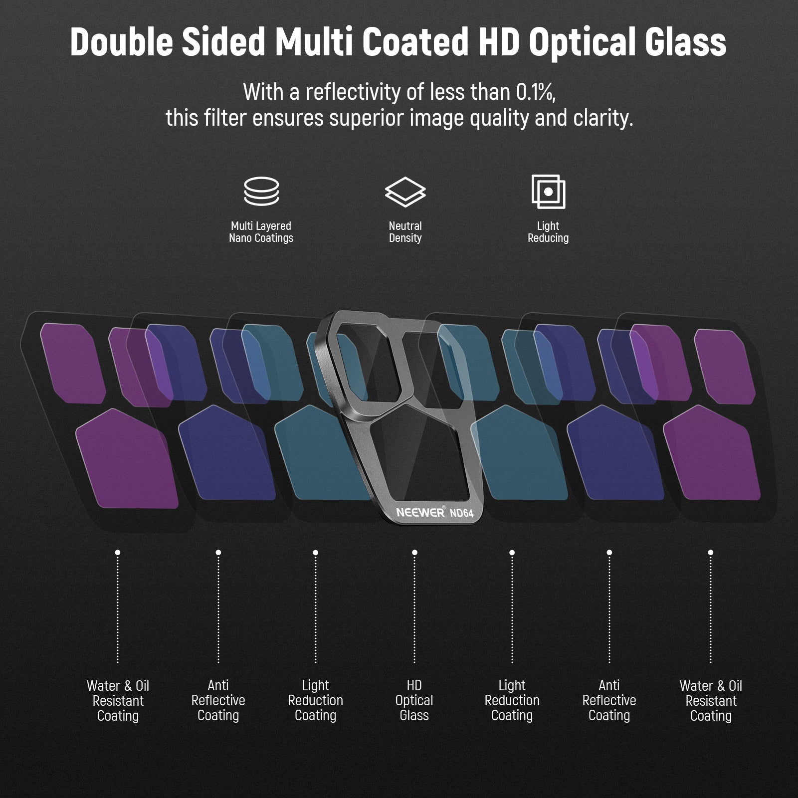 - NANO Coated HD Optical Glass- With 30 layers of multi functional NANO coatings on both sides of the HD optical glass, these filters are water-repellent, scratch-resistant, and oil proof